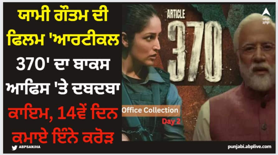 Article 370 Box Office Collection Day 14: ਯਾਮੀ ਗੌਤਮ ਦੀ 'ਆਰਟੀਕਲ 370' ਨੂੰ ਰਿਲੀਜ਼ ਹੋਏ ਦੋ ਹਫ਼ਤੇ ਬੀਤ ਚੁੱਕੇ ਹਨ ਅਤੇ ਇਸ ਫਿਲਮ ਦੀ ਕਮਾਈ ਦਾ ਸਿਲਸਿਲਾ ਜਾਰੀ ਹੈ। ਇਹ ਸਿਆਸੀ ਡਰਾਮਾ ਫਿਲਮ ਆਪਣੀ ਰਿਲੀਜ਼ ਦੇ 14 ਦਿਨ ਬਾਅਦ ਵੀ ਦਰਸ਼ਕਾਂ ਨੂੰ ਸਿਨੇਮਾਘਰਾਂ ਵਿੱਚ ਖਿੱਚਣ ਵਿੱਚ ਸਫਲ ਹੈ ਅਤੇ ਕਰੋੜਾਂ ਰੁਪਏ ਦੀ ਕਮਾਈ ਕਰ ਰਹੀ ਹੈ। ਆਓ ਜਾਣਦੇ ਹਾਂ 'ਧਾਰਾ 370' ਨੇ ਦੂਜੇ ਵੀਰਵਾਰ ਯਾਨੀ 14ਵੇਂ ਦਿਨ ਕਿੰਨੀ ਕਮਾਈ ਕੀਤੀ ਹੈ?