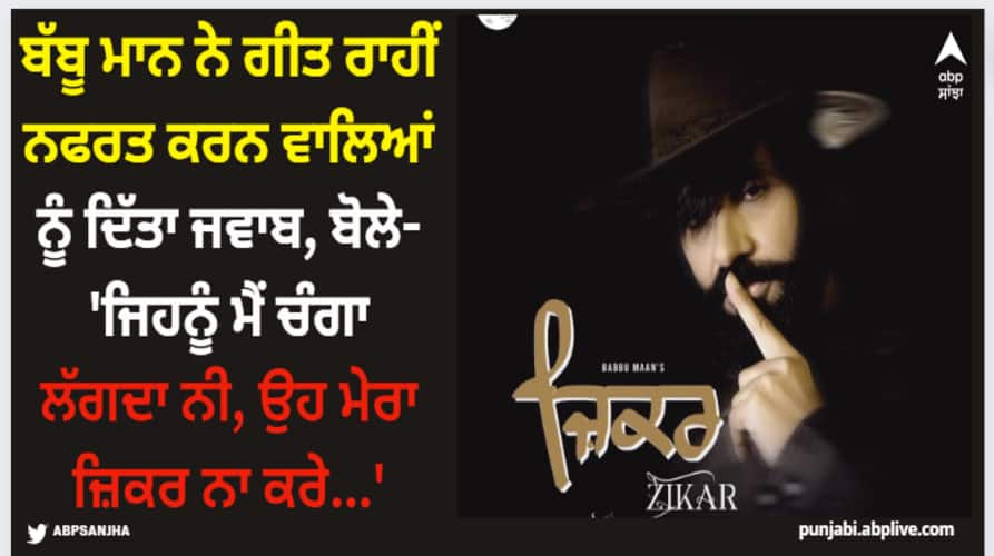 ਬੱਬੂ ਮਾਨ ਅਕਸਰ ਨਫਰਤ ਤੇ ਟਰੋਲ ਕਰਨ ਵਾਲਿਆਂ ਦੇ ਨਿਸ਼ਾਨੇ 'ਤੇ ਰਹਿੰਦੇ ਹਨ। ਹੁਣ ਬੱਬੂ ਮਾਨ ਨੇ ਵੀ ਇਨ੍ਹਾਂ ਹੇਟਰਾਂ ਨੂੰ ਕਰਾਰਾ ਜਵਾਬ ਦਿੱਤਾ ਹੈ। ਗਾਇਕ ਨੇ ਆਪਣਾ ਨਵਾਂ ਗਾਣਾ 'ਜ਼ਿਕਰ' ਰਿਲੀਜ਼ ਕੀਤਾ ਹੈ, ਜਿਸ ਵਿੱਚ ਉਨ੍ਹਾਂ ਨੇ ਆਪਣੇ ਨਫਰਤ ਕਰਨ ਵਾਲਿਆਂ ਨੂੰ ਖਰੀਆਂ-ਖਰੀਆਂ ਸੁਣਾਈਆਂ ਹਨ। ਬੱਬੂ ਮਾਨ ਦੇ ਗਾਣੇ ਦੇ ਬੋਲ ਹਨ, 'ਜਿਹਨੂੰ ਮੈਂ ਚੰਗਾ ਨਹੀਂ ਲੱਗਦਾ, ਉਹ ਮੇਰਾ ਜ਼ਿਕਰ ਨਾ ਕਰੇ।' ਦੇਖੋ ਇਹ ਵੀਡੀਓ: