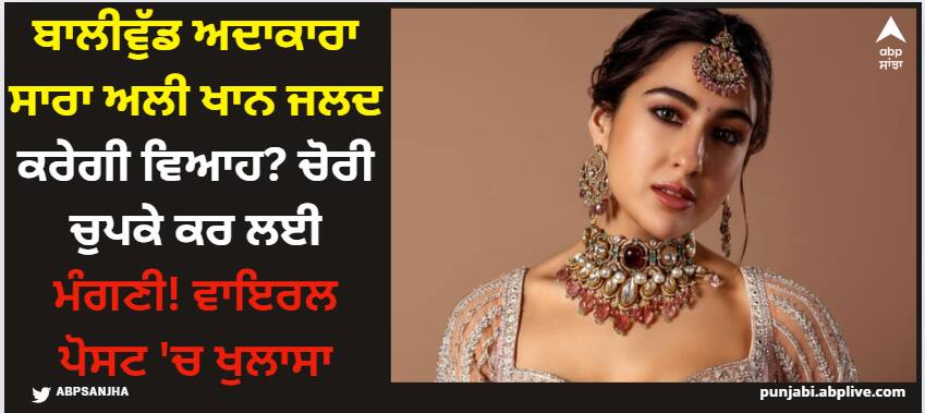 Sara Ali Khan Wedding: ਬਾਲੀਵੁੱਡ ਅਦਾਕਾਰਾ ਸਾਰਾ ਅਲੀ ਖਾਨ ਨੂੰ ਲੈ ਕੇ ਵੱਡੀ ਖਬਰ ਆ ਰਹੀ ਹੈ। ਕਿਹਾ ਜਾ ਰਿਹਾ ਹੈ ਕਿ ਅਦਾਕਾਰਾ ਜਲਦ ਹੀ ਦੁਲਹਨ ਬਣਨ ਵਾਲੀ ਹੈ। ਇੱਕ ਪੋਸਟ ਸਾਹਮਣੇ ਆਈ ਹੈ, ਜਿਸ ਵਿੱਚ ਉਨ੍ਹਾਂ ਦੀ ਮੰਗਣੀ ਅਤੇ ਵਿਆਹ ਬਾਰੇ ਜਾਣਕਾਰੀ ਲਿਖੀ ਗਈ ਹੈ। ਸਾਰਾ ਦੇ ਸਾਰੇ ਪ੍ਰਸ਼ੰਸਕ ਇਸ ਪੋਸਟ ਨੂੰ ਪੜ੍ਹ ਕੇ ਖੁਸ਼ ਹਨ। ਵਾਇਰਲ ਪੋਸਟ 'ਤੇ ਵੱਖ-ਵੱਖ ਪ੍ਰਤੀਕਿਰਿਆਵਾਂ ਸਾਹਮਣੇ ਆ ਰਹੀਆਂ ਹਨ। ਰਿਪੋਰਟ ਮੁਤਾਬਕ ਸੈਫ ਅਲੀ ਖਾਨ ਦੀ ਲਾਡਲੀ ਧੀ ਨੂੰ ਉਸ ਦੇ ਸੁਪਨਿਆਂ ਦਾ ਰਾਜਕੁਮਾਰ ਮਿਲ ਗਿਆ ਹੈ। ਖਬਰਾਂ ਹਨ ਕਿ ਵਿਆਹ ਦੀਆਂ ਰਸਮਾਂ ਸਾਰਾ ਦੇ ਡੈਡੀ ਸੈਫ ਅਲੀ ਖਾਨ ਦੇ ਘਰ ਅਦਾ ਕੀਤੀਆਂ ਜਾਣਗੀਆਂ।
