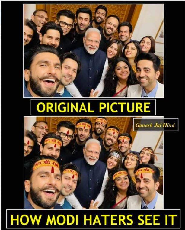 ਮੁੰਬਈ: ਬਾਲੀਵੁੱਡ ਦਾ ਯੰਗ ਡੇਲੀਗੇਸ਼ਨ ਕੱਲ੍ਹ ਹੀ ਦਿੱਲੀ ਵਿੱਚ ਪ੍ਰਧਾਨ ਮੰਤਰੀ ਨਰੇਂਦਰ ਮੋਦੀ ਨੂੰ ਮਿਲਿਆ ਸੀ। ਇਸ ਦੌਰਾਨ ਦੀ ਕਈ ਤਸਵੀਰਾਂ ਇਨ੍ਹਾਂ ਸਟਾਰਸ ਨੇ ਸੋਸ਼ਲ ਮੀਡੀਆ ਅਕਾਊਂਟ ‘ਤੇ ਸ਼ੇਅਰ ਕੀਤੀਆਂ ਹਨ। ਇਨ੍ਹਾਂ ਦਿਨੀਂ ਦੇਸ਼ ‘ਚ ਚੋਣਾਂ ਦਾ ਮਾਹੌਲ ਚਲ ਰਿਹਾ ਹੈ ਜਿਸ ਕਰਕੇ ਟ੍ਰੋਲਰਸ ਨੇ ਪੀਐਮ ਮੋਦੀ ਦੇ ਨਾਲ ਸੈਲਫੀ ਨੂੰ ਲੈ ਕੇ ਜੰਮ ਕੇ ਟਰੋਲ ਕੀਤਾ ਗਿਆ ਹੈ। ਇਸ ਦੌਰਾਨ ਦੀ ਕਈ ਤਸਵੀਰਾਂ ਨਾਲ ਛੇੜਛਾੜ ਕਰ ਇਨ੍ਹਾਂ ਨੂੰ ਵਾਇਰਲ ਕੀਤਾ ਜਾ ਰਿਹਾ ਹੈ। ਇਸ ਸਮੇਂ ਜੋ ਤਸਵੀਰ ਸਭ ਤੋਂ ਜ਼ਿਆਦਾ ਵਾਇਰਲ ਹੋ ਰਹੀ ਹੈ ਉਸ ‘ਚ ਐਡਟਿੰਗ ਨਾਲ ਸਭ ਦੇ ਮੱਥੇ ‘ਤੇ ਜੈ ਸ਼੍ਰੀ ਰਾਮ ਦੀ ਪੱਟੀ ਬੰਨ੍ਹ ਦਿੱਤੀ ਹੈ। ਇਨ੍ਹਾਂ ਤੋਂ ਇਲਾਵਾ ਹੋਰ ਵੀ ਕਈ ਤਸਵੀਰਾਂ ਵਾਇਰਲ ਹੋ ਰਹੀਆਂ ਹਨ ਜਿਨ੍ਹਾਂ ਨੂੰ ਤੁਸੀਂ ਹੇਠ ਦੇਖ ਸਕਦੇ ਹੋ। “The Best Actor” ...😉🤣 #बॉलीवुड #Bollywood pic.twitter.com/AKUmkgY0qv — Raj Mandapwala (@RMandapwala) January 10, 2019 ਮੋਦੀ ਨਾਲ ਇਸ ਖਾਸ ਮੁਲਾਕਾਤ ‘ਚ ਭਾਰਤੀ ਸੱਭਿਅਤਾ ਅਤੇ ਸਮਾਜ ‘ਤੇ ਸਿਨੇਮਾ ਦੇ ਪੈ ਰਹੇ ਪ੍ਰਭਾਅ ‘ਤੇ ਚਰਚਾ ਕੀਤੀ ਗਈ। ਜਿਸ ‘ਚ ਆਲਿਆ ਭੱਟ, ਕਰਨ ਜੌਹਰ, ਰਣਬੀਰ ਕਪੂਰ, ਰਣਵੀਰ ਸਿੰਘ, ਵਿੱਕੀ ਕੌਸ਼ਲ, ਭੂਮੀ ਪੇਡਨੇਕਰ, ਸਿਧਾਰਥ ਮਲਹੋਤਰਾ ਅਤੇ ਆਯੁਸ਼ਮਾਨ ਖੁਰਾਨਾ ਜਿਹੇ ਕਈ ਸਟਾਰਸ ਸ਼ਾਮਲ ਹੋਏ।