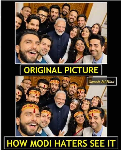 ਮੁੰਬਈ: ਬਾਲੀਵੁੱਡ ਦਾ ਯੰਗ ਡੇਲੀਗੇਸ਼ਨ ਕੱਲ੍ਹ ਹੀ ਦਿੱਲੀ ਵਿੱਚ ਪ੍ਰਧਾਨ ਮੰਤਰੀ ਨਰੇਂਦਰ ਮੋਦੀ ਨੂੰ ਮਿਲਿਆ ਸੀ। ਇਸ ਦੌਰਾਨ ਦੀ ਕਈ ਤਸਵੀਰਾਂ ਇਨ੍ਹਾਂ ਸਟਾਰਸ ਨੇ ਸੋਸ਼ਲ ਮੀਡੀਆ ਅਕਾਊਂਟ ‘ਤੇ ਸ਼ੇਅਰ ਕੀਤੀਆਂ ਹਨ। ਇਨ੍ਹਾਂ ਦਿਨੀਂ ਦੇਸ਼ ‘ਚ ਚੋਣਾਂ ਦਾ ਮਾਹੌਲ ਚਲ ਰਿਹਾ ਹੈ ਜਿਸ ਕਰਕੇ ਟ੍ਰੋਲਰਸ ਨੇ ਪੀਐਮ ਮੋਦੀ ਦੇ ਨਾਲ ਸੈਲਫੀ ਨੂੰ ਲੈ ਕੇ ਜੰਮ ਕੇ ਟਰੋਲ ਕੀਤਾ ਗਿਆ ਹੈ। ਇਸ ਦੌਰਾਨ ਦੀ ਕਈ ਤਸਵੀਰਾਂ ਨਾਲ ਛੇੜਛਾੜ ਕਰ ਇਨ੍ਹਾਂ ਨੂੰ ਵਾਇਰਲ ਕੀਤਾ ਜਾ ਰਿਹਾ ਹੈ। ਇਸ ਸਮੇਂ ਜੋ ਤਸਵੀਰ ਸਭ ਤੋਂ ਜ਼ਿਆਦਾ ਵਾਇਰਲ ਹੋ ਰਹੀ ਹੈ ਉਸ ‘ਚ ਐਡਟਿੰਗ ਨਾਲ ਸਭ ਦੇ ਮੱਥੇ ‘ਤੇ ਜੈ ਸ਼੍ਰੀ ਰਾਮ ਦੀ ਪੱਟੀ ਬੰਨ੍ਹ ਦਿੱਤੀ ਹੈ। ਇਨ੍ਹਾਂ ਤੋਂ ਇਲਾਵਾ ਹੋਰ ਵੀ ਕਈ ਤਸਵੀਰਾਂ ਵਾਇਰਲ ਹੋ ਰਹੀਆਂ ਹਨ ਜਿਨ੍ਹਾਂ ਨੂੰ ਤੁਸੀਂ ਹੇਠ ਦੇਖ ਸਕਦੇ ਹੋ। “The Best Actor” ...😉🤣 #बॉलीवुड#Bollywoodpic.twitter.com/AKUmkgY0qv — Raj Mandapwala (@RMandapwala) January 10, 2019 ਮੋਦੀ ਨਾਲ ਇਸ ਖਾਸ ਮੁਲਾਕਾਤ ‘ਚ ਭਾਰਤੀ ਸੱਭਿਅਤਾ ਅਤੇ ਸਮਾਜ ‘ਤੇ ਸਿਨੇਮਾ ਦੇ ਪੈ ਰਹੇ ਪ੍ਰਭਾਅ ‘ਤੇ ਚਰਚਾ ਕੀਤੀ ਗਈ। ਜਿਸ ‘ਚ ਆਲਿਆ ਭੱਟ, ਕਰਨ ਜੌਹਰ, ਰਣਬੀਰ ਕਪੂਰ, ਰਣਵੀਰ ਸਿੰਘ, ਵਿੱਕੀ ਕੌਸ਼ਲ, ਭੂਮੀ ਪੇਡਨੇਕਰ, ਸਿਧਾਰਥ ਮਲਹੋਤਰਾ ਅਤੇ ਆਯੁਸ਼ਮਾਨ ਖੁਰਾਨਾ ਜਿਹੇ ਕਈ ਸਟਾਰਸ ਸ਼ਾਮਲ ਹੋਏ।