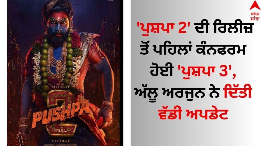 ਜੀ ਹਾਂ, ਹਾਲ ਹੀ 'ਚ ਇੱਕ ਇੰਟਰਵਿਊ ਦੌਰਾਨ ਅੱਲੂ ਅਰਜੁਨ ਨੇ ਪੁਸ਼ਪਾ 3 ਨੂੰ ਲੈ ਕੇ ਇੱੱਕ ਵੱਡਾ ਅਪਡੇਟ ਦਿੱਤਾ ਹੈ, ਜਿਸ ਨੂੰ ਸੁਣ ਕੇ ਪ੍ਰਸ਼ੰਸਕ ਖੁਸ਼ੀ ਨਾਲ ਝੂਮ ਉੱਠਣਗੇ। ਅਦਾਕਾਰ ਨੇ ਕਿਹਾ ਕਿ 'ਤੁਸੀਂ ਯਕੀਨੀ ਤੌਰ 'ਤੇ ਫਿਲਮ ਦੇ ਤੀਜੇ ਹਿੱਸੇ ਦੀ ਉਮੀਦ ਕਰ ਸਕਦੇ ਹੋ। ਅਸੀਂ ਇਸਨੂੰ ਇੱਕ ਫਰੈਂਚਾਇਜ਼ੀ ਬਣਾਉਣਾ ਚਾਹੁੰਦੇ ਹਾਂ ਅਤੇ ਸਾਡੇ ਕੋਲ ਲਾਈਨਅੱਪ ਲਈ ਬਹੁਤ ਸਾਰੇ ਦਿਲਚਸਪ ਵਿਚਾਰ ਹਨ। ਅੱਲੂ ਅਰਜੁਨ ਦੇ ਇਸ ਬਿਆਨ ਤੋਂ ਬਾਅਦ ਇਸ ਗੱਲ ਦੀ ਪੁਸ਼ਟੀ ਹੋ ਗਈ ਹੈ ਕਿ ਮੇਕਰਸ ਪੁਸ਼ਪਾ ਨੂੰ ਲੰਬੇ ਸਮੇਂ ਲਈ ਫ੍ਰੈਂਚਾਇਜ਼ੀ ਲੈਣ ਜਾ ਰਹੇ ਹਨ। ਰਸ਼ਮਿਕਾ ਮੰਡਾਨਾ ਨੇ ਵੀ ਹਿੰਟ ਦਿੱਤਾ