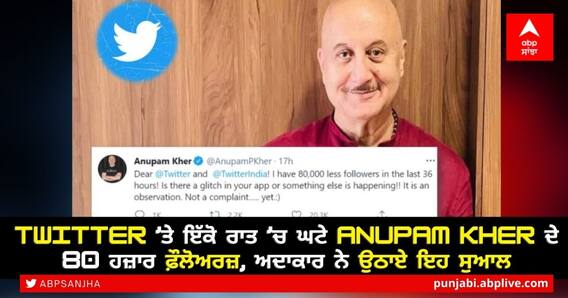 ਅਨੁਪਮ ਖੇਰ ਨੇ ਵੀਰਵਾਰ ਨੂੰ ਟਵੀਟ ਕੀਤਾ,"ਪਿਆਰੇ ਟਵਿੱਟਰ ਤੇ ਟਵਿੱਟਰ ਇੰਡੀਆ। ਪਿਛਲੇ 36 ਘੰਟਿਆਂ ਵਿੱਚ ਮੇਰੇ 80,000 ਫੌਲੋਅਰਜ਼ ਘਟ ਗਏ ਹਨ। ਕੀ ਤੁਹਾਡੀ ਐਪ ਵਿੱਚ ਕੁਝ ਗਲਤੀ ਹੈ ਜਾਂ ਕੁਝ ਹੋਰ ਹੋ ਰਿਹਾ ਹੈ!! ਇਹ ਇੱਕ ਇਤਰਾਜ਼ ਹੈ, ਹਾਲੇ ਕੋਈ ਸ਼ਿਕਾਇਤ ਨਹੀਂ ਹੈ।"