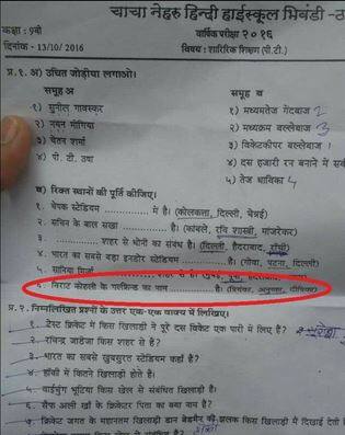 ਠਾਣੇ : ਮਹਾਰਾਸ਼ਟਰ ਵਿੱਚ ਇੱਕ ਸਕੂਲ ਦੀ ਸਾਲਾਨਾ ਪਰੀਖਿਆ ਦੌਰਾਨ ਪ੍ਰਸ਼ਨ ਪੱਤਰ ਵਿੱਚ ਇੱਕ ਸਵਾਲ ਵੇਖ ਕੇ ਨੌਵੀਂ ਜਮਾਤ ਦੇ ਸੈਂਕੜੇ ਵਿਦਿਆਰਥੀ ਹੈਰਾਨ ਰਹਿ ਗਏ। ਸਵਾਲ ਵਿੱਚ ਕ੍ਰਿਕਟਰ ਵਿਰਾਟ ਕੋਹਲੀ ਦੀ ਮਹਿਲਾ ਮਿੱਤਰ ਦਾ ਨਾਮ ਪੁੱਛਿਆ ਗਿਆ ਸੀ। ਸਵਾਲ ਦੇ ਉੱਤਰ ਦੇ ਤੌਰ ਦੇ ਤਿੰਨ ਵਿਕਲਪ ਦਿੱਤੇ ਗਏ ਸਨ। ਪ੍ਰਿਅੰਕਾ ਚੋਪੜਾ, ਅਨੁਸ਼ਕਾ ਸ਼ਰਮਾ ਜਾਂ ਦੀਪਿਕਾ ਪਾਦੁਕੋਨ ਦਾ ਨਾਮ ਵਿਕਲਪ ਦੇ ਤੌਰ 'ਤੇ ਦਿੱਤਾ ਗਿਆ ਸੀ। ਭਿਵੰਡੀ ਕਸਬੇ ਦੇ ਚਾਚਾ ਨੇਹਰੂ ਹਿੰਦੀ ਉੱਚ ਸਕੂਲ ਵਿੱਚ ਵਿਦਿਆਰਥੀਆਂ ਨੂੰ ਦਿੱਤੇ ਗਏ ਪ੍ਰਸ਼ਨ ਪੱਤਰ ਦੀ ਲੀਕ ਕਾਪੀ ਸੋਸ਼ਲ ਮੀਡੀਆ 'ਤੇ ਵਾਇਰਲ ਹੋ ਗਈ ਹੈ। ਸਕੂਲ ਵਿੱਚ 13 ਅਕਤੂਬਰ ਨੂੰ ਸਾਲਾਨਾ ਪਰੀਖਿਆ ਲਈ ਗਈ ਸੀ। ਕਈ ਵਾਰ ਕੋਸ਼ਿਸ਼ ਕਰਨ ਦੇ ਬਾਵਜੂਦ ਸਕੂਲ ਵਿੱਚ ਅਧਿਕਾਰੀ ਮਾਮਲੇ 'ਤੇ ਬੋਲਣ ਲਈ ਉਪਲਬਧ ਨਹੀਂ ਹਨ। ਸਕੂਲ ਦੇ ਪ੍ਰਿੰਸੀਪਲ ਏ.ਆਰ. ਪਾਂਡੇ ਨੇ ਹਾਲਾਂਕਿ ਇੱਕ ਸਥਾਨਕ ਟੈਲੀਵਿਜ਼ਨ ਚੈਨਲ 'ਤੇ ਇਸ ਮਾਮਲੇ ਲਈ ਪੀ.ਟੀ. ਟੀਚਰ ਨੂੰ ਜ਼ਿੰਮੇਵਾਰ ਦੱਸਿਆ, ਜਿਨ੍ਹਾਂ ਨੇ ਇਹ ਪੇਪਰ ਤਿਆਰ ਕੀਤਾ ਸੀ।ਪ੍ਰਿੰਸੀਪਲ ਨੇ ਮੰਨਿਆ ਕਿ ਗ਼ਲਤੀ ਹੋਈ ਹੈ, ਪਰ ਇਸ ਦੇ ਲਈ ਕਿਸੇ ਕਾਰਵਾਈ ਦੀ ਕੋਈ ਗੱਲ ਨਹੀਂ ਕਹੀ।