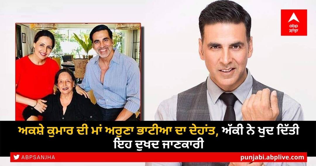 ਅਕਸ਼ੇ ਕੁਮਾਰ ਦੀ ਮਾਂ ਅਰੁਣਾ ਭਾਟੀਆ ਦਾ ਦਿਹਾਂਤ ਹੋ ਗਿਆ ਹੈ। ਅਕਸ਼ੇ ਕੁਮਾਰ ਨੇ ਟਵਿੱਟਰ ਰਾਹੀਂ ਪ੍ਰਸ਼ੰਸਕਾਂ ਨਾਲ ਇਸ ਬੁਰੀ ਖ਼ਬਰ ਨੂੰ ਸਾਂਝਾ ਕੀਤਾ ਹੈ। ਖਿਲਾੜੀ ਕੁਮਾਰ ਨੇ ਆਪਣੀ ਮਾਂ ਨੂੰ ਸ਼ਰਧਾਂਜਲੀ ਦਿੰਦੇ ਹੋਏ ਦੱਸਿਆ ਹੈ ਕਿ ਉਹ ਬਹੁਤ ਹੀ ਬੁਰੇ ਸਮੇਂ ਦਾ ਸਾਹਮਣਾ ਕਰ ਰਹੇ ਹਨ। ਅਕਸ਼ੇ ਕੁਮਾਰ ਦੀ ਮਾਂ ਲੰਮੇ ਸਮੇਂ ਤੋਂ ਬਿਮਾਰ ਸੀ ਅਤੇ ਕੁਝ ਦਿਨ ਪਹਿਲਾਂ ਉਸ ਨੂੰ ਮੁੰਬਈ ਦੇ ਪਵਈ ਦੇ ਹੀਰਾਨੰਦਾਨੀ ਹਸਪਤਾਲ ਵਿੱਚ ਦਾਖਲ ਕਰਵਾਇਆ ਗਿਆ ਸੀ।
