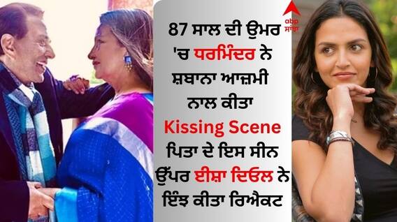 Esha Deol On Dharmendra Kissing Scene: ਫਿਲਮ ਰੌਕੀ ਔਰ ਰਾਣੀ ਕੀ ਪ੍ਰੇਮ ਕਹਾਣੀ ਸੁਪਰਹਿੱਟ ਸਾਬਿਤ ਹੋਈ। ਫਿਲਮ ਨੇ ਬਾਕਸ ਆਫਿਸ 'ਤੇ ਚੰਗਾ ਪ੍ਰਦਰਸ਼ਨ ਕੀਤਾ। ਫਿਲਮ 'ਚ ਆਲੀਆ ਭੱਟ ਅਤੇ ਰਣਵੀਰ ਸਿੰਘ ਦੇ ਕੰਮ ਦੀ ਜਿੱਥੇ ਤਾਰੀਫ ਹੋਈ, ਉਥੇ ਹੀ ਇਹ ਫਿਲਮ ਹਰ ਸਮੇਂ ਇੱਕ ਗੱਲ ਨੂੰ ਲੈ ਕੇ ਸੁਰਖੀਆਂ 'ਚ ਰਹਿੰਦੀ ਹੈ। ਉਹ ਹੈ ਧਰਮਿੰਦਰ ਅਤੇ ਸ਼ਬਾਨਾ ਆਜ਼ਮੀ ਦਾ ਕਿਸਿੰਗ ਸੀਨ। ਜਿੱਥੇ 87 ਸਾਲ ਦੀ ਉਮਰ 'ਚ ਧਰਮਿੰਦਰ ਅਤੇ 72 ਸਾਲ ਦੀ ਉਮਰ 'ਚ ਸ਼ਬਾਨਾ ਆਜ਼ਮੀ ਨੂੰ ਸਕ੍ਰੀਨ 'ਤੇ ਕਿੱਸ ਕਰਦੇ ਦੇਖਣਾ ਸਾਰਿਆਂ ਲਈ ਹੈਰਾਨ ਕਰਨ ਵਾਲਾ ਸੀ, ਜੋ ਅੱਜ ਵੀ ਚਰਚਾ ਵਿੱਚ ਹੈ। ਇਸ ਸੀਨ 'ਤੇ ਧਰਮਿੰਦਰ ਦੇ ਪਰਿਵਾਰਕ ਮੈਂਬਰਾਂ ਦੀਆਂ ਪ੍ਰਤੀਕਿਰਿਆਵਾਂ ਵੀ ਸਾਹਮਣੇ ਆਈਆਂ ਹਨ। ਇਸ ਦੇ ਨਾਲ ਹੀ ਉਨ੍ਹਾਂ ਦੀ ਬੇਟੀ ਈਸ਼ਾ ਦਿਓਲ ਨੇ ਇਸ ਕਿਸਿੰਗ ਸੀਨ 'ਤੇ ਖੁੱਲ੍ਹ ਕੇ ਗੱਲ ਕੀਤੀ ਹੈ। ਇਸ ਬਾਰੇ ਗੱਲ ਕਰਦੇ ਹੋਏ ਇੱਕ ਵਾਰ ਈਸ਼ਾ ਦਿਓਲ ਸ਼ਰਮਾ ਵੀ ਗਈ।