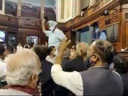 ਨਵੀਂ ਦਿੱਲੀ: ਸੰਸਦ ਦਾ ਮੌਨਸੂਨ ਸੈਸ਼ਨ ਖ਼ਤਮ ਹੋ ਗਿਆ ਹੈ ਪਰ ਸੰਸਦ ਦੇ ਮੌਨਸੂਨ ਸੈਸ਼ਨ ਦੇ ਦੌਰਾਨ ਇੱਕ ਵੀਡੀਓ ਸਾਹਮਣੇ ਆਇਆ ਹੈ, ਜਿਸ ਵਿੱਚ ਇੱਕ ਕਾਂਗਰਸੀ ਨੇਤਾ ਰਾਜ ਸਭਾ ਦੇ ਅੰਦਰ ਮੇਜ਼ 'ਤੇ ਚੜ੍ਹ ਕੇ ਉੱਚੀ ਆਵਾਜ਼ ਵਿੱਚ ਨਾਅਰੇ ਲਗਾਉਂਦੇ ਹੋਏ ਨਜ਼ਰ ਆ ਰਹੇ ਹਨ, ਇੰਨਾ ਹੀ ਨਹੀਂ ਨੇਤਾ ਇਧਰ-ਉਧਰ ਚੀਜ਼ਾਂ ਸੁੱਟਦੇ ਵੀ ਨਜ਼ਰ ਆਏ।