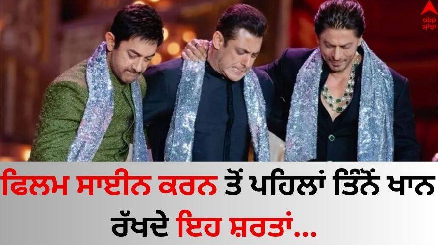 Khans strange conditions before signing film: ਬਾਲੀਵੁੱਡ ਸੁਪਰਸਟਾਰ ਸਾਲ 'ਚ ਕਈ ਫਿਲਮਾਂ ਸਾਈਨ ਕਰਦੇ ਹਨ, ਪਰ ਇਨ੍ਹਾਂ ਫਿਲਮਾਂ ਨੂੰ 'ਸਾਇਨ' ਕਰਨ ਤੋਂ ਪਹਿਲਾਂ ਉਹ ਮੇਕਰਸ ਦੇ ਸਾਹਮਣੇ ਕਈ ਸ਼ਰਤਾਂ ਰੱਖਦੇ ਹਨ। ਪਰ ਅੱਜ ਅਸੀ ਤੁਹਾਨੂੰ ਸਲਮਾਨ ਖਾਨ, ਆਮਿਰ ਖਾਨ ਅਤੇ ਸ਼ਾਹਰੁਖ ਖਾਨ ਦੁਆਰਾ ਰੱਖੀਆਂ ਜਾਣ ਵਾਲੀਆਂ ਅਜੀਬ ਸ਼ਰਤਾਂ ਬਾਰੇ ਦੱਸਣ ਜਾ ਰਹੇ ਹਾਂ। ਦੱਸ ਦੇਈਏ ਕਿ ਜਦੋਂ ਮੇਕਰਸ ਉਨ੍ਹਾਂ ਦੀਆਂ ਸ਼ਰਤਾਂ ਨੂੰ ਮੰਨ ਲੈਂਦੇ ਹਨ ਤਾਂ ਹੀ ਉਹ ਫਿਲਮ ਦਾ ਕੰਟਰੈਕਟ ਸਾਈਨ ਕਰਦੇ ਹਨ।