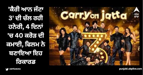 ਫਿਲਮ ਨੇ ਪਹਿਲੇ ਹੀ ਪੂਰੀ ਦੁਨੀਆ 'ਚ 10 ਕਰੋੜ ਦੀ ਕਮਾਈ ਕੀਤੀ ਸੀ। ਇਸ ਤਰ੍ਹਾਂ ਪਹਿਲੇ ਦਿਨ ਇੰਨੀਂ ਕਮਾਈ ਕਰਕੇ ਫਿਲਮ ਨੇ ਇਤਿਹਾਸ ਰਚ ਦਿੱਤਾ ਸੀ। ਹੁਣ ਫਿਲਮ ਦੇ ਨਾਮ ਇੱਕ ਹੋਰ ਨਵਾਂ ਰਿਕਾਰਡ ਬਣਿਆ ਹੈ। ਫਿਲਮ ਨੇ ਮਹਿਜ਼ 4 ਦਿਨਾਂ ਵਿੱਚ ਹੀ ਪੂਰੀ ਦੁਨੀਆ 'ਚ 40 ਕਰੋੜ ਦੀ ਕਮਾਈ ਕਰ ਲਈ ਹੈ। ਇਸ ਦੇ ਨਾਲ ਹੀ 'ਕੈਰੀ ਆਨ ਜੱਟਾ 3' ਸਭ ਤੋਂ ਤੇਜ਼ੀ ਨਾਲ ਇੰਨੀਂ ਕਮਾਈ ਕਰਨ ਵਾਲੀ ਪਹਿਲੀ ਪੰਜਾਬੀ ਫਿਲਮ ਬਣ ਗਈ ਹੈ। ਪੰਜਾਬੀ ਸਿਨੇਮਾ ਦੇ ਲਈ ਇਹ ਬੜੀ ਹੀ ਮਾਣ ਵਾਲੀ ਗੱਲ ਹੈ।