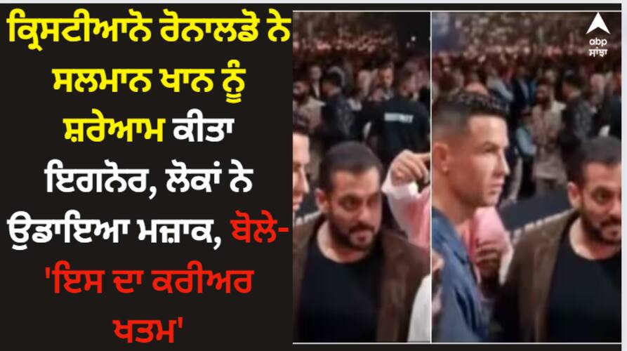 ਰੋਨਾਲਡੋ ਨੇ ਸੁਪਰਸਟਾਰ ਸਲਮਾਨ ਖਾਨ ਨੂੰ ਨਜ਼ਰਅੰਦਾਜ਼ ਕੀਤਾਦਰਅਸਲ ਬੀਤੇ ਦਿਨੀਂ ਸੋਸ਼ਲ ਮੀਡੀਆ 'ਤੇ ਇਕ ਵੀਡੀਓ ਸਾਹਮਣੇ ਆਈ ਸੀ, ਜੋ ਹੁਣ ਚਰਚਾ ਦਾ ਵਿਸ਼ਾ ਬਣ ਗਈ ਹੈ। ਇਸ ਵੀਡੀਓ 'ਚ ਤੁਸੀਂ ਦੇਖ ਸਕਦੇ ਹੋ ਕਿ ਕਿਵੇਂ ਰੋਨਾਲਡੋ ਸਲਮਾਨ ਖਾਨ ਨੂੰ ਨਹੀਂ ਪਛਾਣਦੇ ਅਤੇ ਅੱਗੇ ਵਧਦੇ ਹਨ। ਤੁਹਾਨੂੰ ਦੱਸ ਦੇਈਏ ਕਿ ਦੋਵੇਂ ਸਿਤਾਰੇ ਟਾਈਸਨ ਫਿਊਰੀ ਅਤੇ ਫਰਾਂਸਿਸ ਨਗਨੌ ਵਿਚਾਲੇ MMA ਮੈਚ ਦੇਖਣ ਲਈ ਸਾਊਦੀ ਅਰਬ ਗਏ ਸਨ।