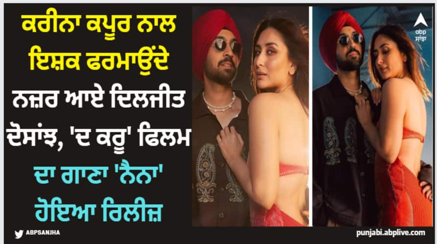 Diljit Dosanjh kareena Kapoor Song Naina Out Now: ਪੰਜਾਬੀ ਸਿੰਗਰ ਤੇ ਗਲੋਬਲ ਆਈਕਨ ਦਿਲਜੀਤ ਦੋਸਾਂਝ ਇੰਨੀਂ ਦਿਨੀਂ ਖੂਬ ਸੁਰਖੀਆਂ 'ਚ ਛਾਏ ਹੋਏ ਹਨ। ਦਿਲਜੀਤ ਨੇ ਹਾਲ ਹੀ 'ਚ ਅਨੰਤ ਅੰਬਾਨੀ ਤੇ ਰਾਧਿਕਾ ਮਰਚੈਂੇਟ ਦੇ ਪ੍ਰੀ ਵੈਡਿੰਗ 'ਚ ਰੌਣਕਾਂ ਲਾਈਆਂ ਸੀ। ਦਿਲਜੀਤ ਨੇ ਆਪਣੇ ਪਾਵਰਪੈਕ ਪਰਫਾਰਮੈਂਸ ਨਾਲ ਹਾਲੀਵੁੱਡ ਗਾਇਕ ਰਿਹਾਨਾ ਨੂੰ ਵੀ ਫੇਲ੍ਹ ਕਰ ਦਿੱਤਾ ਸੀ। ਇਸ ਤੋਂ ਬਾਅਦ ਹੁਣ ਦਿਲਜੀਤ ਆਪਣੀ ਫਿਲਮ 'ਦ ਕਰੂ' ਕਰਕੇ ਫਿਰ ਸੁਰਖੀਆਂ 'ਚ ਹਨ।
