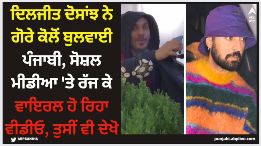 ਇਸ ਤੋਂ ਬਾਅਦ ਹੁਣ ਇੱਕ ਹੋਰ ਅੰਗਰੇਜ਼ ਕੋਲੋਂ ਦਿਲਜੀਤ ਨੇ ਪੰਜਾਬੀ ਬੁਲਵਾਈ ਹੈ। ਦਿਲਜੀਤ ਦੋਸਾਂਝ ਨੇ ਖੁਦ ਇਸ ਵੀਡੀਓ ਨੂੰ ਸੋਸ਼ਲ ਮੀਡੀਆ 'ਤੇ ਸ਼ੇਅਰ ਕੀਤਾ ਹੈ, ਜਿਸ ਵਿੱਚ ਉਹ ਟੇਬਲ 'ਤੇ ਖੜੇ ਦਿਖਾਈ ਦੇ ਰਹੇ ਹਨ ਅਤੇ ਇੱਕ ਵਿਦੇਸ਼ੀ ਆਦਮੀ ਹੇਠਾਂ ਬੈਠਾ ਹੋਇਆ ਪੰਜਾਬੀ ਬੋਲਦਾ ਨਜ਼ਰ ਆ ਰਿਹਾ ਹੈ। ਉੱਪਰ ਖੜੇ ਦਿਲਜੀਤ ਖੁਸ਼ ਹੋ ਰਹੇ ਹਨ ਕਿ ਉਸ ਨੇ ਪੰਜਾਬੀ ਸਿੱਖ ਲਈ। ਤੁਸੀਂ ਵੀ ਦੇਖੋ ਇਹ ਮਜ਼ੇਦਾਰ ਵੀਡੀਓ: