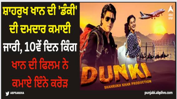 Dunki Box Office Collection Day 10: ਸ਼ਾਹਰੁਖ ਖਾਨ ਦੀ ਫਿਲਮ 'ਡੰਕੀ' ਬਾਕਸ ਆਫਿਸ 'ਤੇ ਧਮਾਕੇਦਾਰ ਕਮਾਈ ਕਰ ਰਹੀ ਹੈ। ਇਹ ਫਿਲਮ 21 ਦਸੰਬਰ ਨੂੰ ਦੁਨੀਆ ਭਰ ਵਿੱਚ ਰਿਲੀਜ਼ ਹੋਈ ਸੀ। 'ਡੰਕੀ' ਨੂੰ ਰਿਲੀਜ਼ ਹੋਏ 10 ਦਿਨ ਹੋ ਚੁੱਕੇ ਹਨ। 10 ਦਿਨਾਂ 'ਚ ਫਿਲਮ ਘਰੇਲੂ ਬਾਕਸ ਆਫਿਸ 'ਤੇ ਹੀ ਨਹੀਂ ਸਗੋਂ ਦੁਨੀਆ ਭਰ 'ਚ ਵੀ ਜ਼ਬਰਦਸਤ ਮੁਨਾਫਾ ਕਮਾ ਰਹੀ ਹੈ। ਜਦੋਂ ਕਿ ਇਹ ਫਿਲਮ ਭਾਰਤ ਵਿੱਚ 200 ਕਰੋੜ ਰੁਪਏ ਦੇ ਕਲੱਬ ਵਿੱਚ ਦਾਖਲ ਹੋਣ ਲਈ ਤਿਆਰ ਹੈ, ਇਹ ਪਹਿਲਾਂ ਹੀ ਦੁਨੀਆ ਭਰ ਵਿੱਚ 300 ਕਰੋੜ ਰੁਪਏ ਤੋਂ ਵੱਧ ਦੀ ਕਮਾਈ ਕਰ ਚੁੱਕੀ ਹੈ।