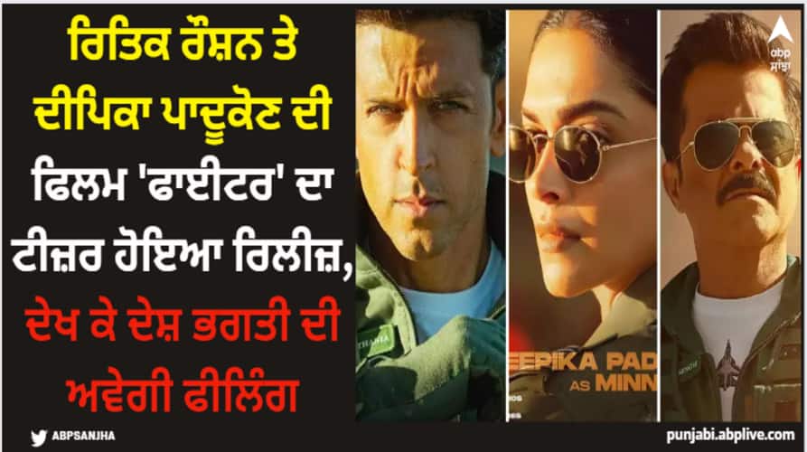 ਰਿਤਿਕ ਰੋਸ਼ਨ, ਦੀਪਿਕਾ ਪਾਦੁਕੋਣ ਸਟਾਰਰ ਫਿਲਮ 'ਫਾਈਟਰ' ਦਾ ਟੀਜ਼ਰ ਰਿਲੀਜ਼ਸਭ ਤੋਂ ਉਡੀਕੀ ਜਾ ਰਹੀ ਫਿਲਮ 'ਫਾਈਟਰ' ਦੇ ਨਿਰਮਾਤਾਵਾਂ ਨੇ ਅੱਜ ਇਸ ਦਾ ਟੀਜ਼ਰ ਰਿਲੀਜ਼ ਕਰਕੇ ਪ੍ਰਸ਼ੰਸਕਾਂ ਨੂੰ ਫਿਲਮ ਦੀ ਪਹਿਲੀ ਝਲਕ ਦਿਖਾਈ ਹੈ। ਇਸ ਏਰੀਅਲ ਐਕਸ਼ਨ ਡਰਾਮਾ ਫਿਲਮ ਦੇ 1 ਮਿੰਟ 13 ਸੈਕਿੰਡ ਦੇ ਟੀਜ਼ਰ 'ਚ ਰਿਤਿਕ ਰੋਸ਼ਨ, ਦੀਪਿਕਾ ਪਾਦੁਕੋਣ ਅਤੇ ਅਨਿਲ ਕਪੂਰ ਦੇ ਦਮਦਾਰ ਲੁੱਕ ਨੂੰ ਦੇਖ ਕੇ ਪ੍ਰਸ਼ੰਸਕ ਦੀਵਾਨੇ ਹੋ ਰਹੇ ਹਨ। ਫੌਜ ਦੀ ਵਰਦੀ ਪਹਿਨੇ ਤਿੰਨੋਂ ਸਿਤਾਰੇ ਸ਼ਾਨਦਾਰ ਦਿਖਾਈ ਦੇ ਰਹੇ ਹਨ। ਇਸ ਤੋਂ ਇਲਾਵਾ, ਉਨ੍ਹਾਂ ਦੇ ਹਵਾਈ ਸਟੰਟ ਦੇਖ ਕੇ ਸਾਡੇ ਹੋਸ਼ ਉੱਡ ਗਏ ਹਨ। ਫਿਲਮ 'ਚ ਦੀਪਿਕਾ ਅਤੇ ਰਿਤਿਕ ਲੜਾਕੂ ਜਹਾਜ਼ 'ਚ ਸਵਾਰ ਹੋ ਕੇ ਹਵਾਈ ਐਕਸ਼ਨ ਕਰਦੇ ਨਜ਼ਰ ਆ ਰਹੇ ਹਨ।