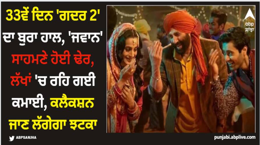 Gadar 2 Box Office Collection Day 33: ਸੰਨੀ ਦਿਓਲ ਸਟਾਰਰ ਫਿਲਮ 'ਗਦਰ 2' ਨੇ ਬਾਕਸ ਆਫਿਸ 'ਤੇ ਇਕ ਮਹੀਨੇ ਤੱਕ ਰਾਜ ਕੀਤਾ ਅਤੇ ਸ਼ਾਨਦਾਰ ਕਮਾਈ ਕਰਕੇ ਇਤਿਹਾਸ ਰਚਿਆ। ਹਾਲਾਂਕਿ 7 ਸਤੰਬਰ ਨੂੰ ਸ਼ਾਹਰੁਖ ਖਾਨ ਦੀ ਫਿਲਮ 'ਜਵਾਨ' ਦੇ ਰਿਲੀਜ਼ ਹੋਣ ਤੋਂ ਬਾਅਦ 'ਗਦਰ 2' ਦੀ ਕਮਾਈ 'ਚ ਲਗਾਤਾਰ ਗਿਰਾਵਟ ਦੇਖਣ ਨੂੰ ਮਿਲ ਰਹੀ ਹੈ। ਰਿਲੀਜ਼ ਦੇ ਪੰਜਵੇਂ ਹਫਤੇ 'ਚ ਸੰਨੀ ਦਿਓਲ ਦੀ ਫਿਲਮ ਬਾਕਸ ਆਫਿਸ 'ਤੇ ਅਸਫਲ ਹੁੰਦੀ ਨਜ਼ਰ ਆ ਰਹੀ ਹੈ। ਫਿਲਮ ਨੇ ਸੋਮਵਾਰ ਨੂੰ ਸਿਰਫ 75 ਲੱਖ ਰੁਪਏ ਦੀ ਕਮਾਈ ਕੀਤੀ ਸੀ ਅਤੇ ਮੰਗਲਵਾਰ ਨੂੰ ਹੋਰ ਗਿਰਾਵਟ ਦੱਸੀ ਜਾ ਰਹੀ ਹੈ। ਆਓ ਜਾਣਦੇ ਹਾਂ 'ਗਦਰ 2' ਨੇ ਆਪਣੀ ਰਿਲੀਜ਼ ਦੇ 33ਵੇਂ ਦਿਨ ਯਾਨੀ ਪੰਜਵੇਂ ਮੰਗਲਵਾਰ ਕਿੰਨੇ ਕਰੋੜ ਰੁਪਏ ਇਕੱਠੇ ਕੀਤੇ ਹਨ?