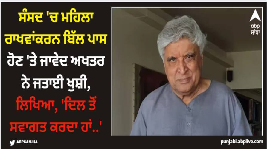 ਜਾਵੇਦ ਅਖਤਰ ਨੇ ਮਹਿਲਾ ਰਾਖਵਾਂਕਰਨ ਬਿੱਲ ਪਾਸ ਹੋਣ 'ਤੇ ਖੁਸ਼ੀ ਜ਼ਾਹਰ ਕੀਤੀਜਾਵੇਦ ਅਖਤਰ ਨੇ ਆਪਣੇ ਸੋਸ਼ਲ ਮੀਡੀਆ ਅਕਾਊਂਟ ਐਕਸ (ਪਹਿਲਾਂ ਟਵਿੱਟਰ ਵਜੋਂ ਜਾਣਿਆ ਜਾਂਦਾ ਸੀ) 'ਤੇ ਲਿਖਿਆ, “ਮੈਂ ਮਹਿਲਾ ਰਿਜ਼ਰਵੇਸ਼ਨ ਬਿੱਲ ਦਾ ਦਿਲੋਂ ਸਵਾਗਤ ਕਰਦਾ ਹਾਂ। ਇਹ ਬਕਾਇਆ ਸੀ। ਹੋ ਸਕਦਾ ਹੈ ਕਿ ਕੁਝ ਲੋਕਾਂ ਦੀ ਰਾਏ ਵਿੱਚ ਇਹ ਸਹੀ ਨਾ ਹੋਵੇ, ਪਰ ਸਮੇਂ ਦੇ ਨਾਲ ਕਈ ਕਾਨੂੰਨਾਂ ਵਿੱਚ ਸੋਧ ਅਤੇ ਸੁਧਾਰ ਕੀਤੇ ਗਏ ਹਨ। "ਆਓ ਘੱਟੋ ਘੱਟ ਪ੍ਰਕਿਰਿਆ ਸ਼ੁਰੂ ਕਰੀਏ।"