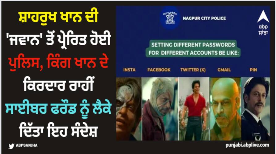 ਨਾਗਪੁਰ ਸਿਟੀ ਪੁਲਿਸ ਨੇ ਆਪਣੇ ਅਧਿਕਾਰਤ ਐਕਸ (ਟਵਿੱਟਰ) ਹੈਂਡਲ 'ਤੇ ਇੱਕ ਪੋਸਟ ਕੀਤੀ ਹੈ। ਇਸ ਪੋਸਟ 'ਚ ਸ਼ਾਹਰੁਖ ਖਾਨ ਦੀ ਫਿਲਮ 'ਜਵਾਨ' ਦਾ ਪੋਸਟਰ ਹੈ, ਜਿਸ 'ਚ ਸ਼ਾਹਰੁਖ ਖਾਨ ਫਿਲਮ 'ਚ ਨਿਭਾਏ 5 ਵੱਖ-ਵੱਖ ਕਿਰਦਾਰਾਂ 'ਚ ਨਜ਼ਰ ਆ ਰਹੇ ਹਨ। ਇਸ ਦੇ ਨਾਲ ਲਿਖਿਆ ਹੈ, ਵੱਖ-ਵੱਖ ਖਾਤਿਆਂ ਲਈ ਵੱਖ-ਵੱਖ ਪਾਸਵਰਡ ਸੈੱਟ ਕਰਨਾ ਅਜਿਹਾ ਹੁੰਦਾ ਹੈ।