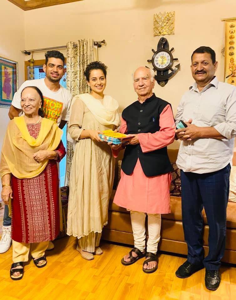 ਪਾਲਮਪੁਰ: ਬਾਲੀਵੁੱਡ ਅਦਾਕਾਰ ਕੰਗਨਾ ਰਣੌਤ ਅੱਜ ਸਾਬਕਾ ਮੁੱਖ ਮੰਤਰੀ ਸ਼ਾਂਤਾ ਕੁਮਾਰ ਨੂੰ ਮਿਲਣ ਲਈ ਪਾਲਮਪੁਰ ਪਹੁੰਚੀ। ਕੰਗਨਾ ਸ਼ਾਂਤਾ ਕੁਮਾਰ ਨੂੰ ਆਪਣੇ ਭਰਾ ਦੇ ਵਿਆਹ ਦਾ ਕਾਰਡ ਦੇਣ ਲਈ ਪਹੁੰਚੀ ਸੀ। ਕੰਗਨਾ ਨੇ ਦੱਸਿਆ ਕਿ ਉਨ੍ਹਾਂ ਦੇ ਸ਼ਾਂਤਾ ਕੁਮਾਰ ਨਾਲ ਪਰਿਵਾਰਿਕ ਰਿਸ਼ਤੇ ਹਨ।