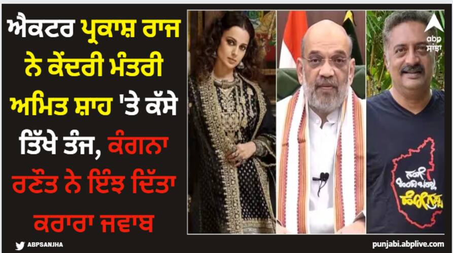 ਕੰਗਨਾ ਰਣੌਤ ਨੇ ਪ੍ਰਕਾਸ਼ ਰਾਜ ਨੂੰ ਹਰਾ ਕੇ ਜਵਾਬ ਦਿੱਤਾ ਹੈਇਸ ਦੇ ਨਾਲ ਹੀ ਪ੍ਰਕਾਸ਼ ਰਾਜ ਵੱਲੋਂ ਅਮਿਤ ਸ਼ਾਹ ਦੇ ਬਿਆਨ 'ਤੇ ਸਵਾਲ ਉਠਾਉਣ ਦਾ ਕਾਫੀ ਵਿਰੋਧ ਹੋ ਰਿਹਾ ਹੈ। ਬਾਲੀਵੁੱਡ ਅਦਾਕਾਰਾ ਕੰਗਨਾ ਰਣੌਤ ਨੇ ਵੀ ਪ੍ਰਕਾਸ਼ ਰਾਜ ਨੂੰ ਜਵਾਬ ਦਿੱਤਾ ਹੈ। ਕੰਗਨਾ ਨੇ ਇਸ ਬਾਰੇ ਆਪਣੇ ਐਕਸ ਅਕਾਊਂਟ 'ਤੇ ਪੋਸਟ ਵੀ ਕੀਤਾ ਹੈ। ਅਦਾਕਾਰਾ ਨੇ ਲਿਖਿਆ ਹੈ, "ਅਮਿਤ ਸ਼ਾਹ ਜੀ ਗੁਜਰਾਤੀ ਹਨ ਅਤੇ ਉਨ੍ਹਾਂ ਦੀ ਮਾਂ ਬੋਲੀ ਵੀ ਗੁਜਰਾਤੀ ਹੈ।"