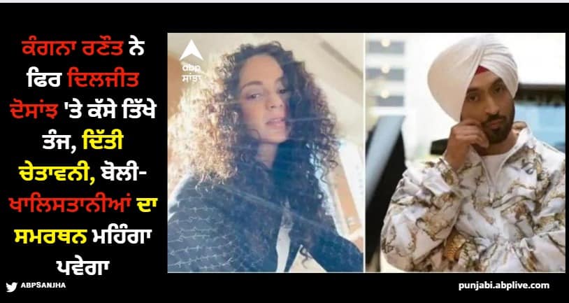 Kangana Ranaut Diljit Dosanjh: ਹਿੰਦੀ ਫਿਲਮ ਅਦਾਕਾਰਾ ਕੰਗਨਾ ਰਣੌਤ ਨੇ ਇੱਕ ਵਾਰ ਮੁੜ ਦਿਲਜੀਤ ਦੋਸਾਂਝ 'ਤੇ ਨਿਸ਼ਾਨਾ ਲਾਇਆ ਹੈ। ਕੱਟੜਪੰਥੀ ਸਿੱਖ ਪ੍ਰਚਾਰਕ ਅਤੇ ਵਾਰਿਸ ਪੰਜਾਬ ਦੇ ਮੁਖੀ ਅੰਮ੍ਰਿਤਪਾਲ ਸਿੰਘ 'ਤੇ ਪੰਜਾਬ ਪੁਲੀਸ ਕਾਰਵਾਈ ਦੇ ਮੱਦਨੇਜ਼ਰ ਕੰਗਨਾ ਨੇ ਅਦਾਕਾਰ ਅਤੇ ਗਾਇਕ ਦਿਲਜੀਤ ਲਈ ਸੋਸ਼ਲ ਮੀਡੀਆ 'ਤੇ ਚੇਤਾਵਨੀ ਵੀ ਪੋਸਟ ਕੀਤੀ ਹੈ। ਇਨ੍ਹੀਂ ਦਿਨੀਂ ਸੋਸ਼ਲ ਮੀਡੀਆ 'ਤੇ ਚੱਲ ਰਹੇ ਮਸ਼ਹੂਰ ਮੀਮ ਦੀ ਮਿਸਾਲ ਦਿੰਦੇ ਹੋਏ ਉਸ ਨੇ ਲਿਖਿਆ, ਦਿਲਜੀਤ ਜੀ 'ਪੁਲਸ ਆ ਗਈ ਪੁਲਸ।’ ਕੰਗਨਾ ਨੇ ਟਵਿੱਟਰ ਅਤੇ ਇੰਸਟਾਗ੍ਰਾਮ ’ਤੇ ਪੋਸਟ ਸ਼ੇਅਰ ਕੀਤੀ ਹੈ।