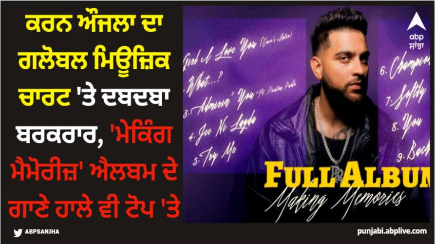 Karan Aujla Album Making Memories: ਕਰਨ ਔਜਲਾ ਪੰਜਾਬੀ ਇੰਡਸਟਰੀ ਦਾ ਟੌਪ ਗਾਇਕ ਹੈ। ਇੰਨੀਂ ਦਿਨੀਂ ਕਰਨ ਔਜਲਾ ਆਪਣੀ ਐਲਬਮ 'ਮੇਕਿੰਗ ਮੈਮੋਰੀਜ਼' ਕਰਕੇ ਕਾਫੀ ਸੁਰਖੀਆਂ ਵਿੱਚ ਹੈ। ਔਜਲਾ ਦੀ ਇਹ ਐਲਬਮ ਜ਼ਬਰਦਸਤ ਹਿੱਟ ਹੋਈ ਹੈ। ਦੱਸ ਦਈਏ ਕਿ 'ਮੇਕਿੰਗ ਮੈਮੋਰੀਜ਼' 18 ਅਗਸਤ ਨੂੰ ਰਿਲੀਜ਼ ਹੋਈ ਸੀ। ਉਸ ਤੋਂ ਬਾਅਦ ਤੋਂ ਹਾਲੇ ਤੱਕ ਕਰਨ ਦੀ ਐਲਬਮ ਮਿਊਜ਼ਿਕ ਚਾਰਟਸ 'ਤੇ ਲਗਾਤਾਰ ਟੌਪ ਕਰ ਰਹੀ ਹੈ।