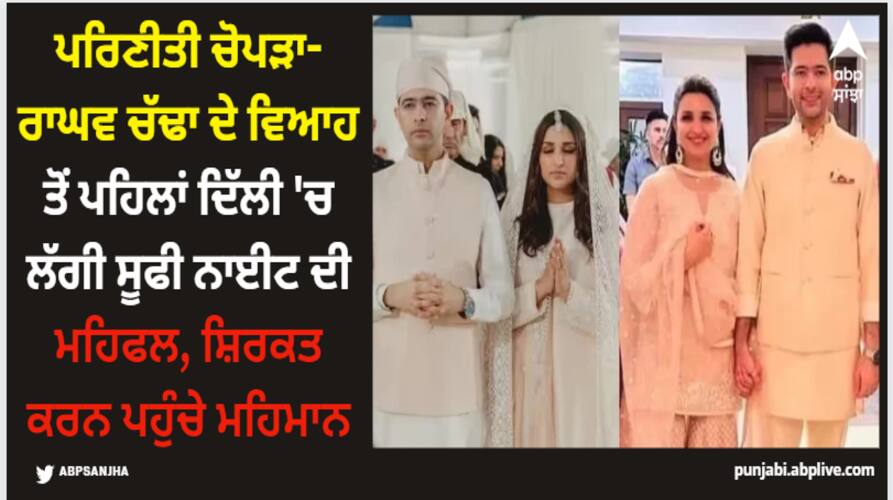 Parineeti-Raghav Wedding: ਪਰਿਣੀਤੀ ਚੋਪੜਾ ਅਤੇ ਰਾਘਵ ਚੱਢਾ ਦੇ ਵਿਆਹ ਤੋਂ ਪਹਿਲਾਂ ਪ੍ਰੀ-ਵੈਡਿੰਗ ਫੰਕਸ਼ਨ ਸ਼ੁਰੂ ਹੋ ਗਏ ਹਨ। ਜੋੜੇ ਦੇ ਵਿਆਹ ਤੋਂ ਪਹਿਲਾਂ ਦੀਆਂ ਰਸਮਾਂ ਦਿੱਲੀ ਵਿੱਚ ਕੀਤੀਆਂ ਜਾ ਰਹੀਆਂ ਹਨ। ਅੱਜ, ਜੋੜੇ ਦੀ ਸੂਫੀ ਨਾਈਟ ਦਾ ਸਮਾਗਮ ਆਯੋਜਿਤ ਕੀਤਾ ਗਿਆ, ਜਿੱਥੇ ਬਾਲੀਵੁੱਡ ਅਤੇ ਰਾਜਨੀਤੀ ਦੇ ਦਿੱਗਜ ਇਕੱਠੇ ਹੋਏ। ਪ੍ਰਿਅੰਕਾ ਚੋਪੜਾ ਦੀ ਮਾਂ ਮਧੂ ਚੋਪੜਾ, ਉਨ੍ਹਾਂ ਦੇ ਭਰਾ ਸਿਧਾਰਥ, ਰਾਜ ਸਭਾ ਮੈਂਬਰ ਅਤੇ ਖਿਡਾਰੀ ਹਰਭਜਨ ਸਿੰਘ ਵਰਗੇ ਕਈ ਮਹਿਮਾਨ ਇਸ ਸਮਾਰੋਹ ਦਾ ਹਿੱਸਾ ਬਣੇ।