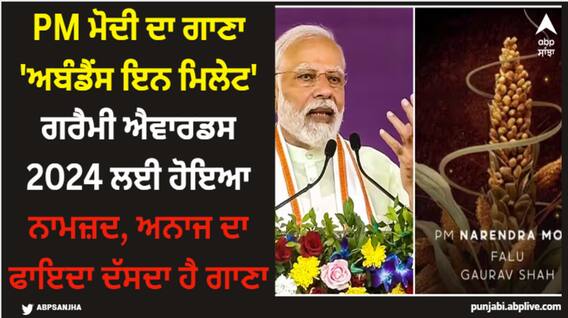PM Modi Song Nominated For Grammy 2024: ਪ੍ਰਧਾਨ ਮੰਤਰੀ ਨਰਿੰਦਰ ਮੋਦੀ ਦੇ ਗਾਣੇ ਅਬਡੈਂਸ ਇਨ ਮਿਲਟਸ ਨੂੰ ਗ੍ਰੈਮੀ ਪੁਰਸਕਾਰ 2024 ਲਈ ਨਾਮਜ਼ਦ ਕੀਤਾ ਗਿਆ ਹੈ। ਇਸ ਗੀਤ ਨੂੰ ਭਾਰਤੀ-ਅਮਰੀਕੀ ਗ੍ਰੈਮੀ ਜੇਤੂ ਗਾਇਕਾ ਫਾਲਗੁਨੀ ਸ਼ਾਹ ਨੇ ਗਾਇਆ ਹੈ। ਇਹ ਗੀਤ 16 ਜੂਨ ਨੂੰ ਰਿਲੀਜ਼ ਹੋਇਆ ਸੀ, ਜੋ ਸਿਹਤ ਲਾਭਾਂ ਅਤੇ ਪੌਸ਼ਟਿਕ ਅਨਾਜ ਨੂੰ ਉਤਸ਼ਾਹਿਤ ਕਰਨ ਲਈ ਸਰਕਾਰ ਦੇ ਯਤਨਾਂ ਨੂੰ ਦਰਸਾਉਂਦਾ ਹੈ।