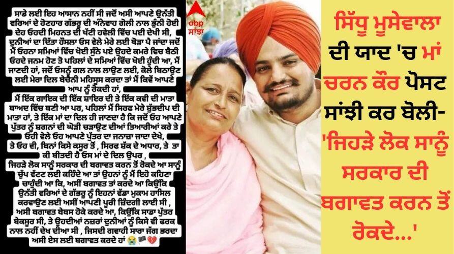 Sidhu Moose Wala Mother New Post: ਪੰਜਾਬੀ ਗਾਇਕ ਸਿੱਧੂ ਮੂਸੇਵਾਲਾ ਦੇ ਮਾਤਾ ਚਰਨ ਕੌਰ ਆਏ ਦਿਨ ਆਪਣੇ ਪੁੱਤਰ ਦੇ ਇਨਸਾਫ ਲਈ ਇੱਕ ਪੋਸਟ ਸਾਂਝੀ ਕਰਦੀ ਹੈ। ਹਾਲੇ ਵੀ ਉਸਦੀਆਂ ਭਿੱਜੀਆਂ ਅੱਖਾਂ ਆਪਣੇ ਪੁੱਤਰ ਦੇ ਇਨਸਾਫ ਲਈ ਜੰਗ ਲੜ੍ਹ ਰਹੀਆਂ ਹਨ। ਦੱਸ ਦੇਈਏ ਕਿ ਸਿੱਧੂ ਦੇ ਪਿਤਾ ਬਲਕੌਰ ਸਿੰਘ ਲਗਾਤਾਰ ਆਪਣੇ ਪੁੱਤਰ ਦੇ ਇਨਸਾਫ ਲਈ ਸਰਕਾਰ ਦੇ ਸਾਹਮਣੇ ਡੱਟ ਕੇ ਖੜ੍ਹੇ ਹਨ। ਹਾਲਾਂਕਿ ਮੂਸੇਵਾਲਾ ਨੂੰ ਹਾਲੇ ਤੱਕ ਇਨਸਾਫ ਨਹੀਂ ਮਿਲਿਆ। ਇਸ ਵਿਚਾਲੇ ਸਿੱਧੂ ਦੀ ਮਾਤਾ ਚਰਨ ਕੌਰ ਵੱਲੋਂ ਆਪਣੇ ਸੋਸ਼ਲ ਮੀਡੀਆ ਹੈਂਡਲ ਉੱਪਰ ਇੱਕ ਪੋਸਟ ਸਾਂਝੀ ਕੀਤੀ ਗਈ ਹੈ। ਜਿਸ ਰਾਹੀਂ ਉਹ ਆਪਣੇ ਦਰਦ ਨੂੰ ਬਿਆਨ ਕਰਦੀ ਹੋਈ ਦਿਖਾਈ ਦੇ ਰਹੀ ਹੈ...