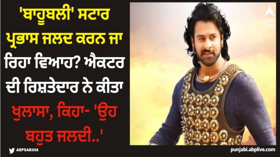 Prabhas Wedding: ਤੇਲਗੂ ਸੁਪਰਸਟਾਰ ਪ੍ਰਭਾਸ ਇਨ੍ਹੀਂ ਦਿਨੀਂ ਸੁਰਖੀਆਂ 'ਚ ਹਨ। ਉਨ੍ਹਾਂ ਦੀ ਫਿਲਮ ਸਲਾਰ ਜਲਦ ਹੀ ਸਿਨੇਮਾਘਰਾਂ 'ਚ ਰਿਲੀਜ਼ ਹੋਣ ਜਾ ਰਹੀ ਹੈ। ਪ੍ਰਸ਼ੰਸਕ ਇਸ ਫਿਲਮ ਦਾ ਬੇਸਬਰੀ ਨਾਲ ਇੰਤਜ਼ਾਰ ਕਰ ਰਹੇ ਹਨ। ਪ੍ਰਭਾਸ ਆਪਣੀ ਪ੍ਰੋਫੈਸ਼ਨਲ ਲਾਈਫ ਦੇ ਨਾਲ-ਨਾਲ ਨਿੱਜੀ ਜ਼ਿੰਦਗੀ ਨੂੰ ਲੈ ਕੇ ਸੁਰਖੀਆਂ 'ਚ ਬਣੇ ਰਹਿੰਦੇ ਹਨ। ਪ੍ਰਭਾਸ ਦਾ ਨਾਂ ਅਨੁਸ਼ਕਾ ਸ਼ੈੱਟੀ ਨਾਲ ਜੋੜਿਆ ਗਿਆ ਹੈ। ਹਾਲ ਹੀ 'ਚ ਆਦਿਪੁਰਸ਼ ਦੌਰਾਨ ਪ੍ਰਭਾਸ ਦਾ ਨਾਂ ਕ੍ਰਿਤੀ ਸੈਨਨ ਨਾਲ ਵੀ ਜੁੜਿਆ ਸੀ। ਪ੍ਰਭਾਸ ਦੇ ਵਿਆਹ ਦਾ ਫੈਨਜ਼ ਬੇਸਬਰੀ ਨਾਲ ਇੰਤਜ਼ਾਰ ਕਰ ਰਹੇ ਹਨ ਅਤੇ ਉਨ੍ਹਾਂ ਦੇ ਵਿਆਹ ਨੂੰ ਲੈ ਕੇ ਵੱਡਾ ਅਪਡੇਟ ਸਾਹਮਣੇ ਆਇਆ ਹੈ।