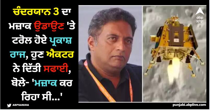 Prakash Raj Clarifies Moon Mission Cartoon: ਪ੍ਰਕਾਸ਼ ਰਾਜ ਨੇ ਇੰਡੀਅਨ ਮੂਨ ਮਿਸ਼ਨ 'ਤੇ ਵਿਅੰਗ ਕੱਸਦੇ ਹੋਏ ਇੱਕ ਪੋਸਟ ਪਾਈ ਸੀ, ਜਿਸ ਲਈ ਲੋਕ ਉਨ੍ਹਾਂ ਨੂੰ ਸੋਸ਼ਲ ਮੀਡੀਆ 'ਤੇ ਟਰੋਲ ਕਰ ਰਹੇ ਹਨ। ਲੋਕਾਂ ਨੇ ਉਸ ਨੂੰ ਸਫਲਤਾ ਵਿਰੋਧੀ (ਐਂਟੀ ਸਕਸੈੱਸ) ਕਹਿ ਕੇ ਟ੍ਰੋਲ ਕਰਨਾ ਸ਼ੁਰੂ ਕਰ ਦਿੱਤਾ, ਜਿਸ ਤੋਂ ਬਾਅਦ ਹੁਣ ਅਦਾਕਾਰ ਨੇ ਆਪਣੀ ਪੋਸਟ 'ਤੇ ਸਫਾਈ ਦਿੰਦੇ ਹੋਏ ਕਿਹਾ ਹੈ ਕਿ ਉਹ ਸਿਰਫ ਮਜ਼ਾਕ ਕਰ ਰਹੇ ਸਨ।