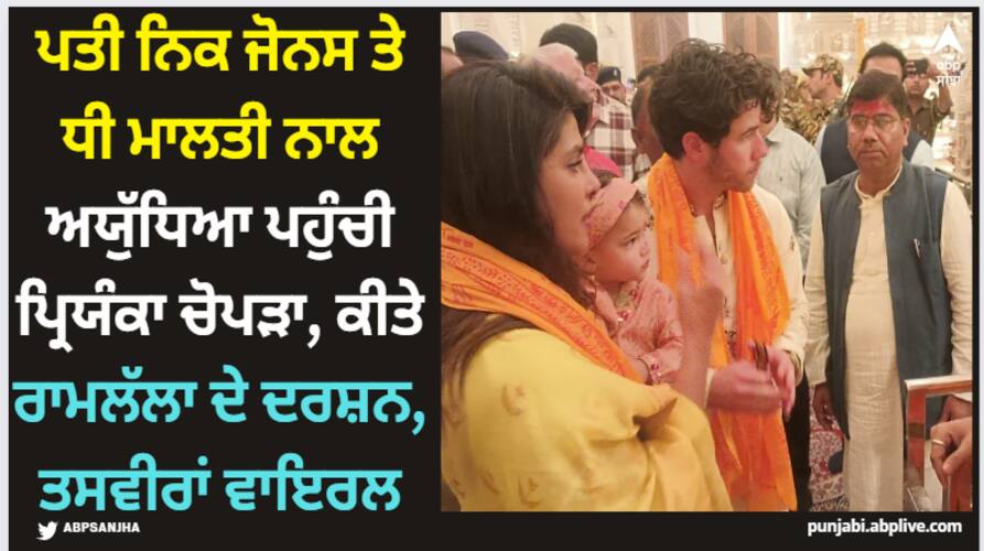 Priyanka Chopra at Ram Janmabhoomi: ਅਦਾਕਾਰਾ ਪ੍ਰਿਅੰਕਾ ਚੋਪੜਾ ਇਨ੍ਹੀਂ ਦਿਨੀਂ ਭਾਰਤ ਆਈ ਹੋਈ ਹੈ। ਉਨ੍ਹਾਂ ਦੇ ਪਤੀ ਨਿਕ ਜੋਨਸ ਅਤੇ ਬੇਟੀ ਮਾਲਤੀ ਮੈਰੀ ਵੀ ਭਾਰਤ 'ਚ ਹਨ। ਬੁੱਧਵਾਰ ਨੂੰ ਅਦਾਕਾਰਾ ਰਾਮ ਲਲਾ ਦੇ ਦਰਸ਼ਨਾਂ ਲਈ ਆਪਣੇ ਪਤੀ ਅਤੇ ਬੇਟੀ ਨਾਲ ਅਯੁੱਧਿਆ ਪਹੁੰਚੀ। ਉਨ੍ਹਾਂ ਦੇ ਅਯੁੱਧਿਆ ਜਾਣ ਅਤੇ ਮੰਦਰ ਦੇ ਦਰਸ਼ਨ ਕਰਨ ਦੀਆਂ ਤਸਵੀਰਾਂ ਸੋਸ਼ਲ ਮੀਡੀਆ 'ਤੇ ਵਾਇਰਲ ਹੋ ਰਹੀਆਂ ਹਨ।