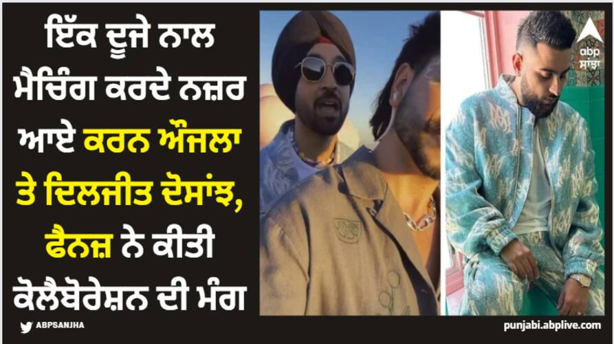 Diljit Dosanjh Karan Aujla: ਦਿਲਜੀਤ ਦੋਸਾਂਝ ਅਤੇ ਕਰਨ ਔਜਲਾ ਇਸ ਦੌਰ ਦੇ ਬਿਹਤਰੀਨ ਪੰਜਾਬੀ ਗਾਇਕਾਂ ਵਿੱਚੋਂ ਇੱਕ ਹਨ। ਇਹ ਦੋਵੇਂ ਆਪਣੇ ਸੰਗੀਤ ਅਤੇ ਸੁਪਰਹਿੱਟ ਗਾਇਕੀ ਦੇ ਹੁਨਰ ਨਾਲ ਬੁਲੰਦੀਆਂ 'ਤੇ ਹਨ। ਹਾਲ ਹੀ 'ਚ ਦਿਲਜੀਤ ਦੋਸਾਂਝ ਅਤੇ ਕਰਨ ਔਜਲਾ ਦੀਆਂ ਤਸਵੀਰਾਂ ਵਾਇਰਲ ਹੋ ਰਹੀਆਂ ਹਨ, ਜਿਸ 'ਚ ਦੋਵੇਂ ਬਿਲਕੁਲ ਇਕੋ ਜਿਹੇ ਕੱਪੜਿਆਂ 'ਚ ਨਜ਼ਰ ਆ ਰਹੇ ਹਨ।