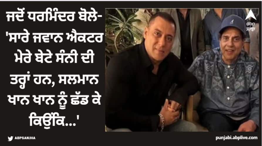 ਸਲਮਾਨ-ਧਰਮਿੰਦਰ ਦੀ ਫੋਟੋ ਹੋ ਰਹੀ ਵਾਇਰਲਧਰਮਿੰਦਰ ਅਤੇ ਸਲਮਾਨ ਖਾਨ ਦੋਵਾਂ ਦੀ ਆਪਣੇ ਪ੍ਰਸ਼ੰਸਕਾਂ ਵਿੱਚ ਜ਼ਬਰਦਸਤ ਫੈਨ ਫਾਲੋਇੰਗ ਹੈ। ਹਾਲ ਹੀ 'ਚ 'ਗਦਰ 2' ਦੀ ਸਫਲਤਾ ਪਾਰਟੀ ਹੋਈ, ਜਿਸ 'ਚ ਕਈ ਸਿਤਾਰੇ ਇਕ-ਦੂਜੇ ਨੂੰ ਮਿਲੇ। ਇਨ੍ਹਾਂ 'ਚੋਂ ਸਲਮਾਨ ਖਾਨ ਅਤੇ ਧਰਮਿੰਦਰ ਦੀ ਇਕ ਫੋਟੋ ਨੂੰ ਕਾਫੀ ਪਸੰਦ ਕੀਤਾ ਜਾ ਰਿਹਾ ਹੈ। ਦੋਵੇਂ ਹੱਥ ਫੜ ਕੇ ਬੈਠੇ ਹਨ। ਹੁਣ ਇੱਕ Reddit ਯੂਜ਼ਰ ਨੇ ਇੱਕ ਪੁਰਾਣੀ ਵੀਡੀਓ ਸ਼ੇਅਰ ਕੀਤੀ ਹੈ। ਇਸ 'ਚ ਸਲਮਾਨ ਖਾਨ ਧਰਮਿੰਦਰ ਸੰਨੀ ਦਿਓਲ ਨਾਲ ਹੋਸਟ ਸ਼ੋਅ 'ਚ ਪਹੁੰਚੇ ਹਨ। ਉੱਥੇ ਉਹ ਸਲਮਾਨ ਨੂੰ ਕਹਿੰਦੀ ਹੈ ਕਿ ਉਹ ਉਸ ਵਰਗਾ ਹੈ।