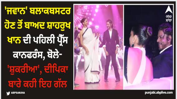 Shah Rukh Khan On Jawan Success: ਬਾਲੀਵੁੱਡ ਸੁਪਰਸਟਾਰ ਸ਼ਾਹਰੁਖ ਖਾਨ ਇਸ ਸਮੇਂ ਸੱਤਵੇਂ ਅਸਮਾਨ 'ਤੇ ਹਨ। ਅਦਾਕਾਰ ਦੀ ਫਿਲਮ 'ਜਵਾਨ' 'ਤੇ ਪ੍ਰਸ਼ੰਸਕ ਅਥਾਹ ਪਿਆਰ ਦੀ ਵਰਖਾ ਕਰ ਰਹੇ ਹਨ। ਇਹ ਫਿਲਮ ਬਲਾਕਬਸਟਰ ਬਣ ਚੁੱਕੀ ਹੈ ਅਤੇ ਹੁਣ ਪਹਿਲੀ ਵਾਰ ਸ਼ਾਹਰੁਖ ਖਾਨ ਸਮੇਤ ਪੂਰੀ ਸਟਾਰ ਕਾਸਟ ਨੇ ਪ੍ਰੈੱਸ ਕਾਨਫਰੰਸ ਕੀਤੀ। ਇਸ ਦੌਰਾਨ ਸ਼ਾਹਰੁਖ ਖਾਨ ਦੇ ਨਾਲ ਦੀਪਿਕਾ ਪਾਦੂਕੋਣ, ਸੁਨੀਲ ਗਰੋਵਰ, ਸਾਨਿਆ ਮਲਹੋਤਰਾ, ਰਿਧੀ ਡੋਗਰਾ, ਨਿਰਦੇਸ਼ਕ ਐਟਲੀ ਕੁਮਾਰ ਸਮੇਤ ਪੂਰੀ ਸਟਾਰ ਕਾਸਟ ਮੌਜੂਦ ਸੀ। ਹਾਲਾਂਕਿ ਫਿਲਮ ਦੀ ਲੀਡ ਲੇਡੀ ਨਯਨਤਾਰਾ ਇਸ ਪ੍ਰੈੱਸ ਕਾਨਫਰੰਸ 'ਚ ਸ਼ਾਮਲ ਨਹੀਂ ਹੋਈ। ਉਹ ਵੀਡੀਓ ਕਾਲ ਰਾਹੀਂ ਸ਼ਾਮਲ ਹੋਈ।