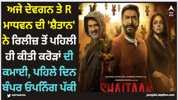 Shaitaan Advance Booking Day 1: ਅਜੇ ਦੇਵਗਨ ਅਤੇ ਆਰ ਮਾਧਵਨ ਦੀ ਆਉਣ ਵਾਲੀ ਡਰਾਉਣੀ ਫਿਲਮ 'ਸ਼ੈਤਾਨ' ਕੱਲ ਯਾਨੀ 8 ਮਾਰਚ ਨੂੰ ਸਿਨੇਮਾਘਰਾਂ 'ਚ ਰਿਲੀਜ਼ ਹੋਣ ਜਾ ਰਹੀ ਹੈ। ਇਸ ਫਿਲਮ ਦੇ ਟ੍ਰੇਲਰ ਦੇ ਰਿਲੀਜ਼ ਹੋਣ ਤੋਂ ਬਾਅਦ ਤੋਂ ਹੀ ਪ੍ਰਸ਼ੰਸਕ ਇਸ ਦੇ ਰਿਲੀਜ਼ ਹੋਣ ਦਾ ਬੇਸਬਰੀ ਨਾਲ ਇੰਤਜ਼ਾਰ ਕਰ ਰਹੇ ਹਨ ਅਤੇ ਇਸ ਦੇ ਨਾਲ ਹੀ ਇਸ ਫਿਲਮ ਦੀ ਪਹਿਲੇ ਦਿਨ ਦੀ ਵੱਡੀ ਐਡਵਾਂਸ ਬੁਕਿੰਗ ਵੀ ਕੀਤੀ ਜਾ ਰਹੀ ਹੈ। ਆਓ ਜਾਣਦੇ ਹਾਂ 'ਸ਼ੈਤਾਨ' ਦੇ ਪਹਿਲੇ ਦਿਨ ਦੇ ਸ਼ੋਅ ਦੀਆਂ ਕਿੰਨੀਆਂ ਟਿਕਟਾਂ ਪਹਿਲਾਂ ਤੋਂ ਵਿਕ ਚੁੱਕੀਆਂ ਹਨ ਅਤੇ ਰਿਲੀਜ਼ ਤੋਂ ਪਹਿਲਾਂ ਇਸ ਨੇ ਕਿੰਨਾ ਕਲੈਕਸ਼ਨ ਕੀਤਾ ਹੈ?