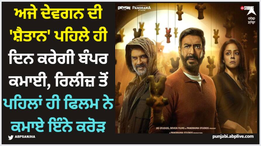 Shaitaan Advance Booking Day 1: ਯਾਮੀ ਗੌਤਮ ਦੀ 'ਆਰਟੀਕਲ 370' ਇਨ੍ਹੀਂ ਦਿਨੀਂ ਬਾਕਸ ਆਫਿਸ 'ਤੇ ਧਮਾਲ ਮਚਾ ਰਹੀ ਹੈ। ਇਸ ਫਿਲਮ ਨੇ ਰਿਲੀਜ਼ ਦੇ 10 ਦਿਨਾਂ ਦੇ ਅੰਦਰ ਹੀ ਆਪਣੇ ਬਜਟ ਤੋਂ ਤਿੰਨ ਗੁਣਾ ਵੱਧ ਕਮਾਈ ਕਰ ਲਈ ਹੈ। ਹੁਣ ਅਜੇ ਦੇਵਗਨ ਅਤੇ ਆਰ ਮਾਧਵਨ ਸਟਾਰਰ ਫਿਲਮ 'ਸ਼ੈਤਾਨ' ਵੀ ਸਿਨੇਮਾਘਰਾਂ 'ਚ ਰਿਲੀਜ਼ ਹੋਣ ਜਾ ਰਹੀ ਹੈ। ਪ੍ਰਸ਼ੰਸਕ ਇਸ ਹੌਰਰ ਥ੍ਰਿਲਰ ਫਿਲਮ ਦਾ ਬੇਸਬਰੀ ਨਾਲ ਇੰਤਜ਼ਾਰ ਕਰ ਰਹੇ ਹਨ। ਇਸ ਸਭ ਦੇ ਵਿਚਕਾਰ ਫਿਲਮ ਦੀ ਐਡਵਾਂਸ ਬੁਕਿੰਗ ਸ਼ੁਰੂ ਹੋ ਚੁੱਕੀ ਹੈ। ਆਓ ਜਾਣਦੇ ਹਾਂ ਪਹਿਲੇ ਦਿਨ ਦੀ ਐਡਵਾਂਸ ਬੁਕਿੰਗ 'ਚ 'ਸ਼ੈਤਾਨ' ਨੇ ਹੁਣ ਤੱਕ ਕਿੰਨੀ ਕਮਾਈ ਕੀਤੀ ਹੈ।