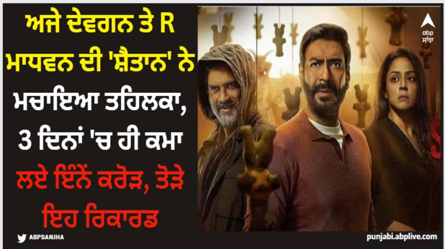 Shaitaan Box Office Collection Day 3: ਅਜੇ ਦੇਵਗਨ ਅਤੇ ਆਰ ਮਾਧਵਨ ਦੀ ਹਾਲ ਹੀ ਵਿੱਚ ਰਿਲੀਜ਼ ਹੋਈ ਫਿਲਮ 'ਸ਼ੈਤਾਨ' ਸਿਨੇਮਾਘਰਾਂ ਵਿੱਚ ਛਾਈ ਹੋਈ ਹੈ। ਫਿਲਮ 8 ਮਾਰਚ ਨੂੰ ਸਿਨੇਮਾਘਰਾਂ 'ਚ ਆਈ ਅਤੇ ਰਿਲੀਜ਼ ਦੇ ਤਿੰਨ ਦਿਨਾਂ ਦੇ ਅੰਦਰ ਹੀ ਫਿਲਮ ਨੇ ਬਾਕਸ ਆਫਿਸ 'ਤੇ ਆਪਣੀ ਪਕੜ ਮਜ਼ਬੂਤ ਕਰ ਲਈ ਹੈ। ਫਿਲਮ ਨੂੰ ਦਰਸ਼ਕਾਂ ਦਾ ਭਰਵਾਂ ਹੁੰਗਾਰਾ ਮਿਲ ਰਿਹਾ ਹੈ ਅਤੇ ਪਹਿਲੇ ਦਿਨ ਸ਼ਾਨਦਾਰ ਸ਼ੁਰੂਆਤ ਕਰਨ ਤੋਂ ਬਾਅਦ 'ਸ਼ੈਤਾਨ' ਵੀਕੈਂਡ 'ਚ ਵੀ ਵੱਡੀ ਕਮਾਈ ਕਰ ਰਹੀ ਹੈ।