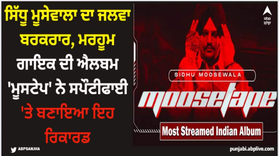 ਸਿੱਧੂ ਮੂਸੇਵਾਲਾ ਦੀ ਐਲਬਮ 'ਮੂਸਟੇਪ' ਸਪੌਟੀਫਾਈ 'ਤੇ ਭਾਰਤ ਦੀ ਸਭ ਤੋਂ ਵੱਧ ਸੁਣੀ ਜਾਣ ਵਾਲੀ ਐਲਬਮ ਬਣ ਗਈ ਹੈ। ਸਿੱਧੂ ਦੀ ਇਸ ਐਲਬਮ ਨੂੰ ਸਪੌਟੀਫਾਈ 'ਤੇ 1 ਬਿਲੀਅਨ ਤੋਂ ਵੱਧ ਲੋਕਾਂ ਨੇ ਸਟ੍ਰੀਮ ਕੀਤਾ ਹੈ। ਇਹ ਆਪਣੇ ਆਪ 'ਚ ਵੱਡਾ ਰਿਕਾਰਡ ਹੈ ਕਿ ਭਾਰਤ ਦੀ ਸਭ ਤੋਂ ਵੱਧ ਸੁਣੀ ਜਾਣ ਵਾਲੀ ਐਲਬਮ ਕਿਸੇ ਪੰਜਾਬੀ ਗਾਇਕ ਦੀ ਹੈ ਅਤੇ ਉਹ ਗਾਇਕ ਕੋਈ ਹੋਰ ਨਹੀਂ ਬਲਕਿ ਸਭ ਦਾ ਚਹੇਤਾ ਸਿੱਧੂ ਮੂਸੇਵਾਲਾ ਹੈ।
