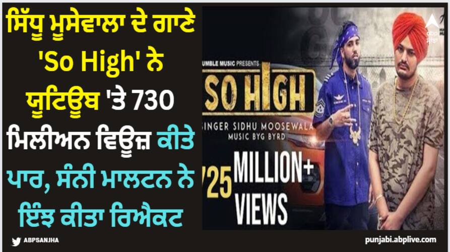 ਹੁਣ ਸਿੱਧੂ ਮੂਸੇਵਾਲਾ ਨੂੰ ਲੈਕੇ ਨਵੀਂ ਅਪਡੇਟ ਸਾਹਮਣੇ ਆ ਰਹੀ ਹੈ। ਸਿੱਧੂ ਦੇ ਪਹਿਲੇ ਗਾਣੇ 'ਸੋ ਹਾਈ' (So High Sidhu Moose Wala) ਨੇ ਯੂਟਿਊਬ 'ਤੇ 730 ਮਿਲੀਅਨ ਯਾਨਿ 73 ਕਰੋੜ ਵਿਊਜ਼ ਪੂਰੇ ਕੀਤੇ ਹਨ। ਇਹ ਸਿੱਧੂ ਦਾ ਯੂਟਿਊਬ 'ਤੇ ਸਭ ਤੋਂ ਵੱਧ ਸੁਣਿਆ ਜਾਣ ਵਾਲਾ ਗਾਣਾ ਬਣ ਗਿਆ ਹੈ। ਇਸ ਬਾਰੇ ਸਿੱਧੂ ਦੇ ਬੈਸਟ ਫਰੈਂਡ ਤੇ ਰੈਪਰ ਸੰਨੀ ਮਾਲਟਨ ਨੇ ਸੋਸ਼ਲ ਮੀਡੀਆ 'ਤੇ ਪੋਸਟ ਵੀ ਸ਼ੇਅਰ ਕੀਤੀ ਹੈ। ਉਸ ਨੇ ਲਿਿਖਿਆ, '730 ਮਿਲੀਅਨ। ਬਿੱਗ ਬਰਡ ਨੇ ਇਸ ਗਾਣੇ ਨੂੰ ਨੀਂਦ 'ਚ ਬਣਾਇਆ ਸੀ। ਇਹ ਵੀਡੀਓ ਬਣਾਉਣ 'ਤੇ 500 ਡਾਲਰ ਦਾ ਖਰਚਾ ਆਇਆ ਸੀ। ਇਸ ਗਾਣੇ 'ਚ ਬਰਾਂਡਿਡ ਕੱਪੜੇ ਨਹੀਂ, ਸਿਰਫ ਟੈਲੇਂਟ ਹੈ।'