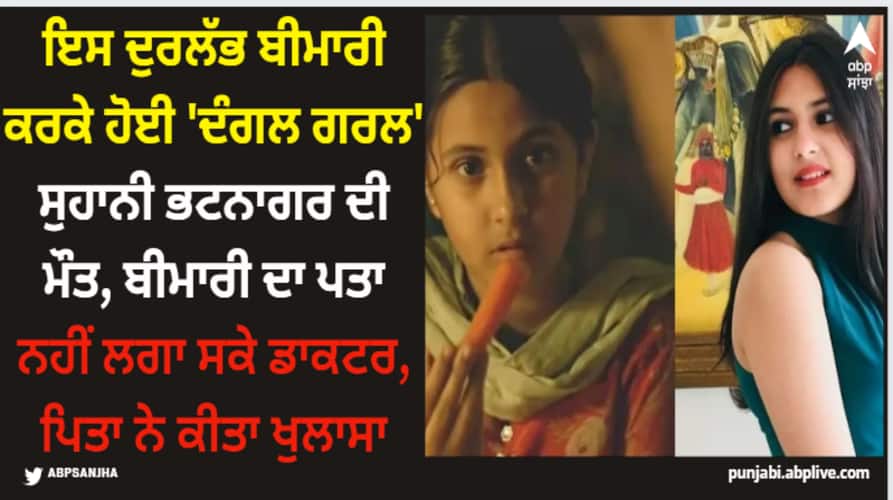 Suhani Bhatnagar Death: ਫਿਲਮ ਦੰਗਲ ਵਿੱਚ ਪਹਿਲਵਾਨ ਬਬੀਤਾ ਫੋਗਾਟ ਦੇ ਬਚਪਨ ਦੀ ਭੂਮਿਕਾ ਨਿਭਾਉਣ ਵਾਲੀ ਸੁਹਾਨੀ ਭਟਨਾਗਰ ਦਾ ਸ਼ਨੀਵਾਰ ਨੂੰ ਸਿਰਫ 19 ਸਾਲ ਦੀ ਉਮਰ ਵਿੱਚ ਦਿੱਲੀ ਦੇ ਏਮਜ਼ ਵਿੱਚ ਦਿਹਾਂਤ ਹੋ ਗਿਆ। ਦੱਸਿਆ ਜਾ ਰਿਹਾ ਹੈ ਕਿ ਦੋ ਮਹੀਨੇ ਪਹਿਲਾਂ ਸੁਹਾਨੀ ਦੇ ਹੱਥ ਸੁੱਜ ਗਏ ਸਨ ਅਤੇ ਉਸ ਦੇ ਸਰੀਰ 'ਤੇ ਲਾਲ ਧੱਫੜ ਨਜ਼ਰ ਆਉਣ ਲੱਗੇ ਸਨ।
