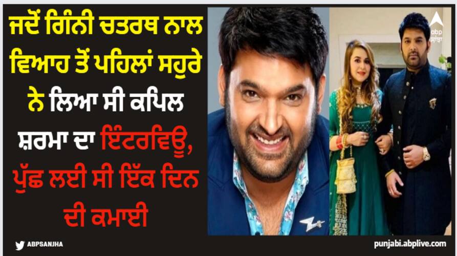 Kapil Sharma News: ਕਾਮੇਡੀਅਨ ਕਪਿਲ ਸ਼ਰਮਾ ਨੇ ਵਿਆਹ ਦੇ 5 ਸਾਲ (12 ਦਸੰਬਰ) ਪੂਰੇ ਕਰ ਲਏ ਹਨ। ਉਨ੍ਹਾਂ ਦਾ ਵਿਆਹ ਗਿੰਨੀ ਚਤਰਥ ਨਾਲ ਹੋਇਆ ਹੈ। ਕਪਿਲ ਅਤੇ ਗਿੰਨੀ ਇਕੱਠੇ ਬਹੁਤ ਖੁਸ਼ ਹਨ ਅਤੇ ਖੁਸ਼ਹਾਲ ਜ਼ਿੰਦਗੀ ਦਾ ਆਨੰਦ ਲੈ ਰਹੇ ਹਨ। ਪਰ ਕੀ ਤੁਹਾਨੂੰ ਪਤਾ ਹੈ ਕਿ ਗਿੰਨੀ ਨਾਲ ਵਿਆਹ ਤੋਂ ਪਹਿਲਾਂ ਕਪਿਲ ਸ਼ਰਮਾ ਦਾ ਉਨ੍ਹਾਂ ਦੇ ਸਹੁਰੇ ਨੇ ਇੰਟਰਵਿਊ ਲਿਆ ਸੀ। ਕਪਿਲ ਸ਼ਰਮਾ ਨੇ ਖੁਦ ਇਸ ਦਾ ਖੁਲਾਸਾ ਕੀਤਾ ਸੀ।