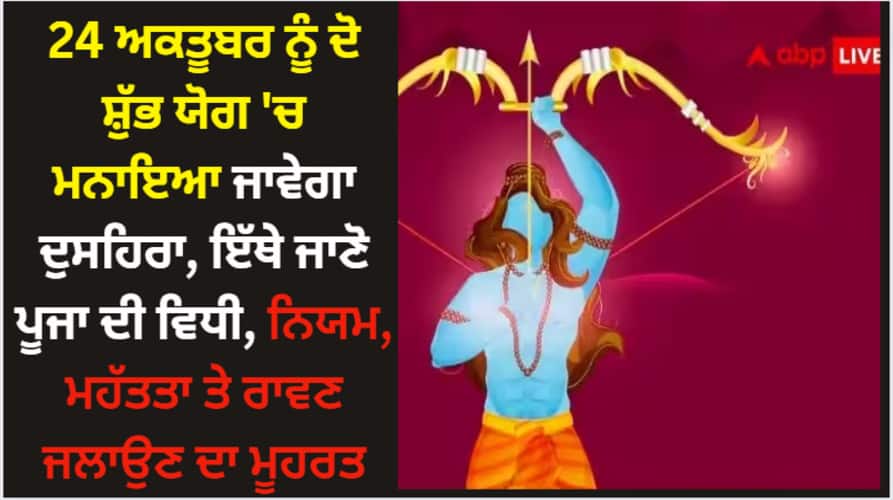 ਰਵੀ ਯੋਗ: ਪੰਚਾਂਗ ਅਨੁਸਾਰ ਦੁਸਹਿਰੇ ਵਾਲੇ ਦਿਨ 24 ਅਕਤੂਬਰ ਨੂੰ ਸਵੇਰੇ 6:27 ਤੋਂ 3:38 ਵਜੇ ਤੱਕ ਅਤੇ 25 ਅਕਤੂਬਰ ਨੂੰ ਸ਼ਾਮ 6:38 ਤੋਂ 6:28 ਤੱਕ ਰਵੀ ਯੋਗ ਹੋਵੇਗਾ। ਜੋਤਿਸ਼ ਸ਼ਾਸਤਰ ਅਨੁਸਾਰ ਰਵੀ ਯੋਗ ਨੂੰ ਬਹੁਤ ਸ਼ੁਭ ਮੰਨਿਆ ਜਾਂਦਾ ਹੈ ਅਤੇ ਇਸ ਸਮੇਂ ਦੌਰਾਨ ਕੋਈ ਵੀ ਸ਼ੁਭ ਕੰਮ ਸ਼ੁਰੂ ਕਰਨ ਨਾਲ ਸਫਲਤਾ ਮਿਲਦੀ ਹੈ।ਰਿੱਧੀ ਯੋਗ: ਦੁਸਹਿਰੇ 'ਤੇ ਰਵੀ ਯੋਗ ਦੇ ਨਾਲ-ਨਾਲ ਵਰਧੀ ਯੋਗ ਵੀ ਬਣਾਇਆ ਜਾ ਰਿਹਾ ਹੈ। ਵ੍ਰਿਧੀ ਯੋਗ 24 ਅਕਤੂਬਰ ਨੂੰ ਦੁਪਹਿਰ 3:40 ਵਜੇ ਤੋਂ ਸ਼ੁਰੂ ਹੋਵੇਗਾ ਅਤੇ ਇਹ ਯੋਗ 24 ਅਕਤੂਬਰ ਦੀ ਪੂਰੀ ਰਾਤ ਤੱਕ ਜਾਰੀ ਰਹੇਗਾ। ਇਸ ਦੌਰਾਨ ਦੁਸਹਿਰੇ ਦੀ ਪੂਜਾ ਕਰਨ ਨਾਲ ਤੁਹਾਡੀਆਂ ਮਨੋਕਾਮਨਾਵਾਂ ਪੂਰੀਆਂ ਹੋਣਗੀਆਂ।