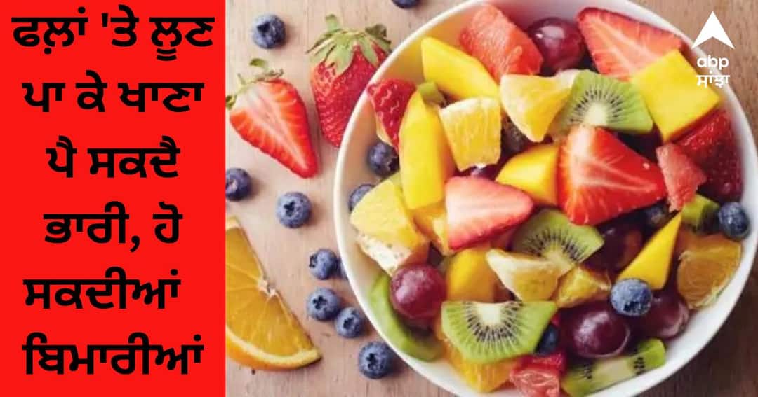 ਫਲਾਂ 'ਤੇ ਨਮਕ ਛਿੜਕਣ ਨਾਲ ਸਰੀਰ 'ਚ ਨਮਕ ਦੀ ਮਾਤਰਾ ਵਧ ਜਾਂਦੀ ਹੈ, ਜੋ ਸਰੀਰ ਨੂੰ ਨੁਕਸਾਨ ਪਹੁੰਚਾ ਸਕਦੀ ਹੈ। ਹਰ ਵਿਅਕਤੀ ਨੂੰ ਸੀਮਤ ਮਾਤਰਾ ਵਿੱਚ ਨਮਕ ਦਾ ਸੇਵਨ ਕਰਨਾ ਚਾਹੀਦਾ ਹੈ। ਦਿਨ ਭਰ ਤਾਂ ਤੁਸੀਂ ਸਬਜ਼ੀਆਂ ਅਤੇ ਖਾਣੇ 'ਚ ਨਮਕ ਦਾ ਸੇਵਨ ਕਰਦੇ ਰਹੇ ਹੋ ਪਰ ਜੇਕਰ ਤੁਸੀਂ ਹੁਣ ਫਲਾਂ 'ਤੇ ਵੀ ਲੂਣ ਛਿੜਕਦੇ ਹੋ ਤਾਂ ਇਸ ਨਾਲ ਸਰੀਰ 'ਚ ਲੂਣ ਦੀ ਮਾਤਰਾ ਵਧ ਸਕਦੀ ਹੈ। ਇਸ ਨਾਲ ਬੀਪੀ ਅਤੇ ਦਿਲ ਦੀਆਂ ਸਮੱਸਿਆਵਾਂ ਹੋ ਸਕਦੀਆਂ ਹਨ।