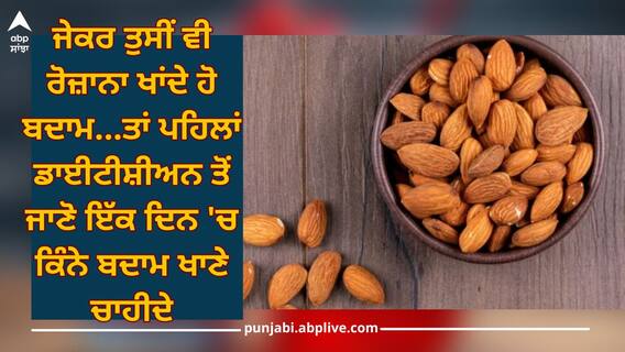 ਜਾਣੋ ਤੁਸੀਂ ਰੋਜ਼ਾਨਾ ਕਿੰਨੇ ਬਦਾਮ ਖਾ ਸਕਦੇ ਹੋਇੱਕ ਡਾਇਟੀਸ਼ੀਅਨ ਦੇ ਅਨੁਸਾਰ, ਜੇਕਰ ਅਸੀਂ ਰੋਜ਼ਾਨਾ ਭਿੱਜੇ ਹੋਏ ਬਦਾਮ ਖਾਂਦੇ ਹਾਂ, ਤਾਂ ਲਗਭਗ 30 ਤੋਂ 50 ਗ੍ਰਾਮ ਯਾਨੀ ਲਗਭਗ 7 ਤੋਂ 8 ਬਦਾਮ ਰੋਜ਼ਾਨਾ ਖਾਣੇ ਚਾਹੀਦੇ ਹਨ। ਬਦਾਮ ਇੱਕ ਬਹੁਤ ਹੀ ਪੌਸ਼ਟਿਕ ਅਤੇ ਊਰਜਾਵਾਨ ਸੁੱਕਾ ਫਲ ਹੈ।