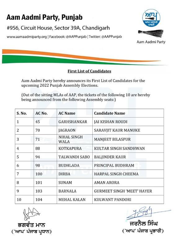 ਇਸ ਸੂਚੀ ਅਨੁਸਾਰ ਬੁਢਲਾਡਾ ਤੋਂ ਪ੍ਰਿੰਸੀਪਲ ਬੂੱਧ ਰਾਮ, ਤਲਵੰਡੀ ਸਾਬੋ ਤੋਂ ਬਲਜਿੰਦਰ ਕੌਰ, ਸੁਨਾਮ ਤੋਂ ਅਮਨ ਅਰੋੜਾ, ਕੋਟਕਪੂਰਾ ਤੋਂ ਕੁਲਤਾਰ ਸਿੰਘ ਸੰਧਵਾਂ, ਦਿੜ੍ਹਬਾ ਤੋਂ ਹਰਪਾਲ ਸਿੰਘ ਚੀਮਾ, ਬਰਨਾਲਾ ਤੋਂ ਗੁਰਮੀਤ ਸਿੰਘ ਮੀਤ ਹੇਅਰ, ਗੜ੍ਹਸ਼ੰਕਰ ਤੋਂ ਜੈ ਕ੍ਰਿਸ਼ਨ ਰੋੜੀ ਨੂੰ ਉਮੀਦਵਾਰ ਬਣਾਇਆ ਹੈ।