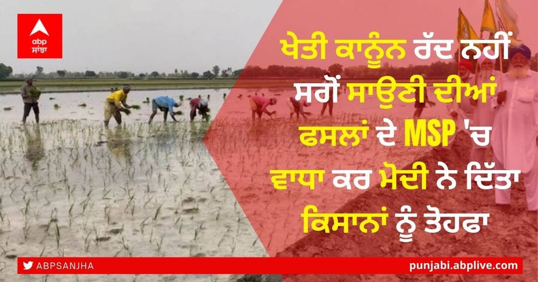 ਨਵੀਂ ਦਿੱਲੀ: ਮੋਦੀ ਸਰਕਾਰ ਨੇ ਇੱਕ ਵਾਰ ਫਿਰ ਕਿਸਾਨਾਂ ਨੂੰ ਰਾਹਤ ਦਿੰਦਿਆਂ ਸਾਉਣੀ ਦੀਆਂ ਫਸਲਾਂ ਦੇ ਘੱਟੋ ਘੱਟ ਸਮਰਥਨ ਮੁੱਲ ਵਿੱਚ ਵਾਧਾ ਕਰਨ ਦਾ ਫ਼ੈਸਲਾ ਕੀਤਾ ਹੈ। ਇਸ ਦਾ ਫ਼ੈਸਲਾ ਬੁੱਧਵਾਰ ਨੂੰ ਮੰਤਰੀ ਮੰਡਲ ਦੀ ਮੀਟਿੰਗ ਵਿੱਚ ਲਿਆ ਗਿਆ। ਇਹ ਜਾਣਕਾਰੀ ਦਿੰਦਿਆਂ ਖੇਤੀਬਾੜੀ ਮੰਤਰੀ ਨਰਿੰਦਰ ਸਿੰਘ ਤੋਮਰ ਨੇ ਦੱਸਿਆ ਕਿ ਝੋਨੇ ਉੱਤੇ ਘੱਟੋ ਘੱਟ ਸਮਰਥਨ ਮੁੱਲ ਵਿਚ 72 ਰੁਪਏ ਦਾ ਵਾਧਾ ਕੀਤਾ ਗਿਆ ਹੈ। ਜਿਸ ਤੋਂ ਬਾਅਦ 1868 ਰੁਪਏ ਪ੍ਰਤੀ ਕੁਇੰਟਲ ਤੋਂ ਬਾਅਦ ਝੋਨਾ ਹੁਣ ਵਧ ਕੇ 1940 ਰੁਪਏ ਪ੍ਰਤੀ ਕੁਇੰਟਲ ਹੋ ਗਿਆ ਹੈ। ਇਸ ਦੇ ਨਾਲ ਹੀ ਬਾਜਰਾ 'ਤੇ ਐਮਐਸਪੀ 2150 ਰੁਪਏ ਪ੍ਰਤੀ ਕੁਇੰਟਲ ਤੋਂ ਵਧਾ ਕੇ 2250 ਰੁਪਏ ਪ੍ਰਤੀ ਕੁਇੰਟਲ ਕਰ ਦਿੱਤਾ ਗਿਆ ਹੈ।