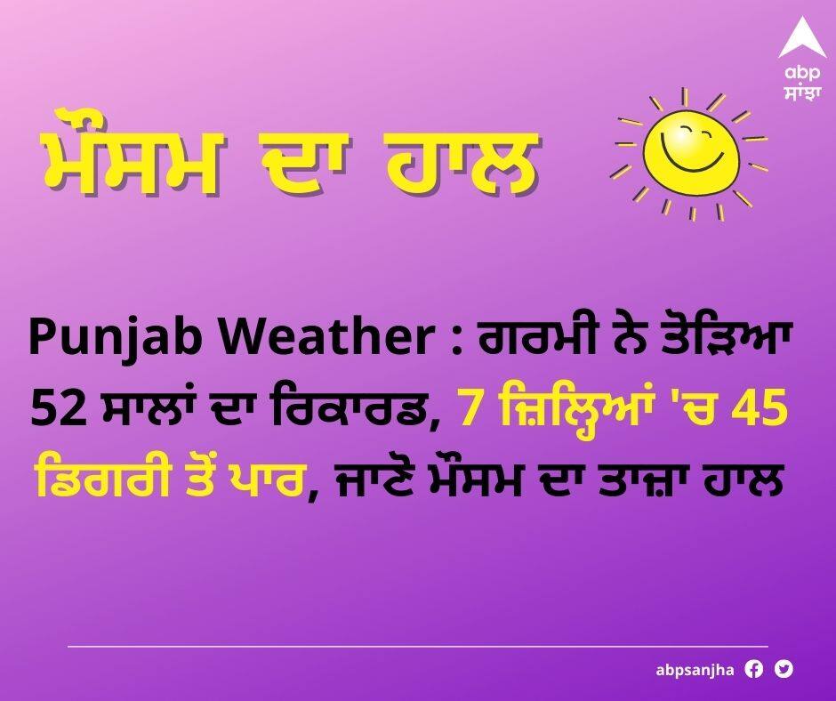 Punjab Weather Update : ਪੰਜਾਬ ’ਚ ਚੱਲ ਰਹੀ ਲੂ ਤੇ ਭਿਆਨਕ ਗਰਮੀ ਕਾਰਨ ਸ਼ਨੀਵਾਰ ਨੂੰ ਕਈ ਜ਼ਿਲ੍ਹਿਆਂ ’ਚ ਤਾਪਮਾਨ ਮਈ ਮਹੀਨੇ ’ਚ ਆਪਣੇ ਹੁਣ ਤਕ ਦੇ ਉੱਚ ਪੱਧਰ ’ਤੇ ਪੁੱਜ ਗਿਆ ਹੈ ਤੇ 52 ਸਾਲਾਂ ’ਚ ਪਹਿਲੀ ਵਾਰੀ ਮਈ ਦੇ ਪਹਿਲੇ 15 ਦਿਨਾਂ ’ਚ ਤਾਪਮਾਨ 44.5 ਡਿਗਰੀ ਸੈਲਸੀਅਸ ਤੋਂ ਉੱਪਰ ਗਿਆ ਹੈ। ਮੌਸਮ ਵਿਭਾਗ ਚੰਡੀਗੜ੍ਹ ਮੁਤਾਬਕ ਪੰਜਾਬ ਦੇ ਕਈ ਜ਼ਿਲ੍ਹਿਆਂ ’ਚ ਵੱਧ ਤੋਂ ਵੱਧ ਤਾਪਮਾਨ ਸਾਧਾਰਨ ਤੋਂ ਪੰਜ ਤੋਂ ਸੱਤ ਡਿਗਰੀ ਸੈਲਸੀਅਸ ਜ਼ਿਆਦਾ ਦਰਜ ਕੀਤਾ ਗਿਆ।