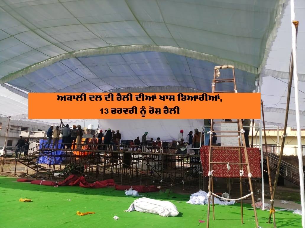 ਅੰਮ੍ਰਿਤਸਰ: ਅਕਾਲੀ ਦਲ ਵੱਲੋਂ ਅੰਮ੍ਰਿਤਸਰ ਜ਼ਿਲ੍ਹੇ ਦੇ ਰਾਜਾਸਾਂਸੀ ਹਲਕੇ 'ਚ ਭਲਕੇ 13 ਫਰਵਰੀ ਨੂੰ ਰੋਸ ਰੈਲੀ ਕੀਤੀ ਜਾ ਰਹੀ ਹੈ। ਇਸ ਰੈਲੀ 'ਚ ਅਕਾਲੀ ਦਲ ਦੇ ਸਰਪ੍ਰਸਤ ਅਤੇ ਸਾਬਕਾ ਮੁੱਖ ਮੰਤਰੀ ਪ੍ਰਕਾਸ਼ ਸਿੰਘ ਬਾਦਲ, ਅਕਾਲੀ ਦਲ ਦੇ ਪ੍ਰਧਾਨ ਸੁਖਬੀਰ ਬਾਦਲ, ਬਿਕਰਮ ਸਿੰਘ ਮਜੀਠੀਆ ਸਣੇ ਭਾਜਪਾ ਦੇ ਪ੍ਰਧਾਨ ਅਸ਼ਵਨੀ ਸ਼ਰਮਾ ਵੀ ਪਹੁੰਚ ਰਹੇ ਹਨ। ਰੈਲੀ ਦੀਆਂ ਤਿਆਰੀਆਂ ਸ਼ੁਰੂ ਹੋ ਚੁੱਕੀਆਂ ਹਨ।