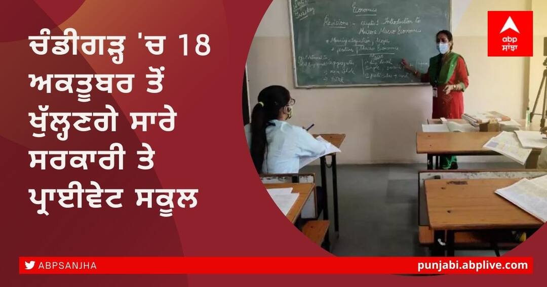 ਚੰਡੀਗੜ੍ਹ: ਯੂਟੀ ਚੰਡੀਗੜ੍ਹ ਵਿੱਚ ਸਾਰੇ ਸਰਕਾਰੀ ਤੇ ਪ੍ਰਾਈਵੇਟ ਸਕੂਲ 18 ਅਕਤੂਬਰ ਤੋਂ ਖੁੱਲ੍ਹਣਗੇ। ਇਹ ਸਕੂਲ ਨਰਸਰੀ ਤੋਂ ਉਤੇ ਦੀਆਂ ਸਾਰੀਆਂ ਕਲਾਸਾਂ ਲਈ ਖੋਲ੍ਹਣ ਦੀ ਯੋਜਨਾ ਹੈ। ਇਸ ਬਾਰੇ ਸਿੱਖਿਆ ਵਿਭਾਗ ਦੇ ਪ੍ਰਸਤਾਵ ਨੂੰ ਸਿੱਖਿਆ ਸਕੱਤਰ ਨੇ ਮਨਜ਼ੂਰੀ ਦੇ ਦਿੱਤੀ ਹੈ।