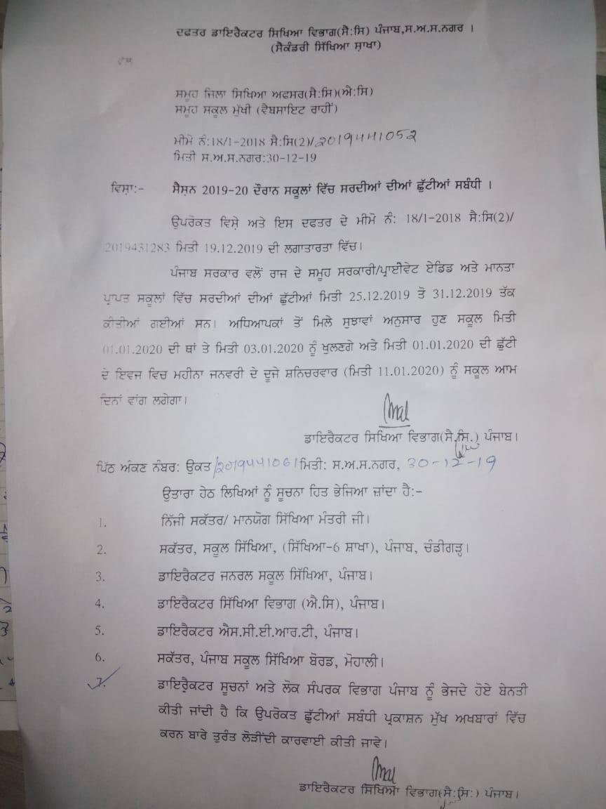 ਚੰਡੀਗੜ੍ਹ: ਸਿੱਖਿਆ ਮਹਿਕਮੇ ਨੇ ਸਰਦੀਆਂ ਦੀਆਂ ਛੁੱਟੀਆਂ ਵਿੱਚ ਵਾਧਾ ਕਰ ਦਿੱਤਾ ਹੈ। ਪੰਜਾਬ ਦੇ ਸਕੂਲ ਪਹਿਲੀ ਜਨਵਰੀ ਨੂੰ ਖੁੱਲ੍ਹਣੇ ਸੀ ਜੋ ਹੁਣ ਤਿੰਨ ਜਨਵਰੀ ਨੂੰ ਖੁੱਲ੍ਹਣਗੇ।